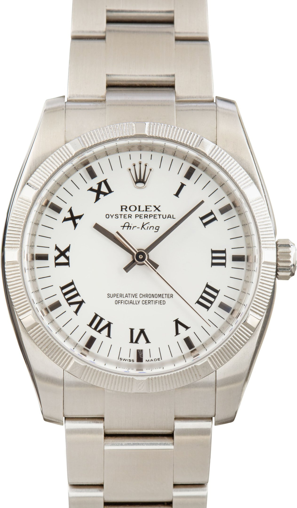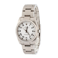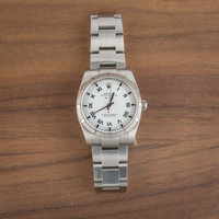 Why We Love This Watch This Rolex Air-King ref. 114210 (2007–2008) features a 34mm stainless steel case with an engine-turned bezel, giving it a refined yet sporty presence. Its clean white dial is set with Roman numerals for a classic aesthetic, paired with the durable Oyster bracelet for everyday wear. Powered by the Caliber 3130 automatic movement, it delivers reliable precision and timeless Rolex craftsmanship in a versatile midsize design. WATCH DETAILS CREDIT CARD PRICE $6,374.66 BRAND Rolex MODEL NAME Air-King MODEL NUMBER 114210 YEAR 2008 ITEM NUMBER 182145 CONDITION Excellent GENDER Mens Womens Unisex BOX & PAPERS Box Only CASE MATERIAL Stainless Steel CRYSTAL Sapphire SIZE 34MM BEZEL Stainless Steel Engine Turned CASEBACK Solid SERIAL M383XXX DIAL White w/ Roman hour markers, Non-Luminous hands & Nonluminous lume MOVEMENT CALIBRE 3130 TYPE Automatic BEZEL Fixed COMPLICATION No Date BRACELET MATERIAL Stainless Steel TYPE Oyster CLASP Oysterclasp