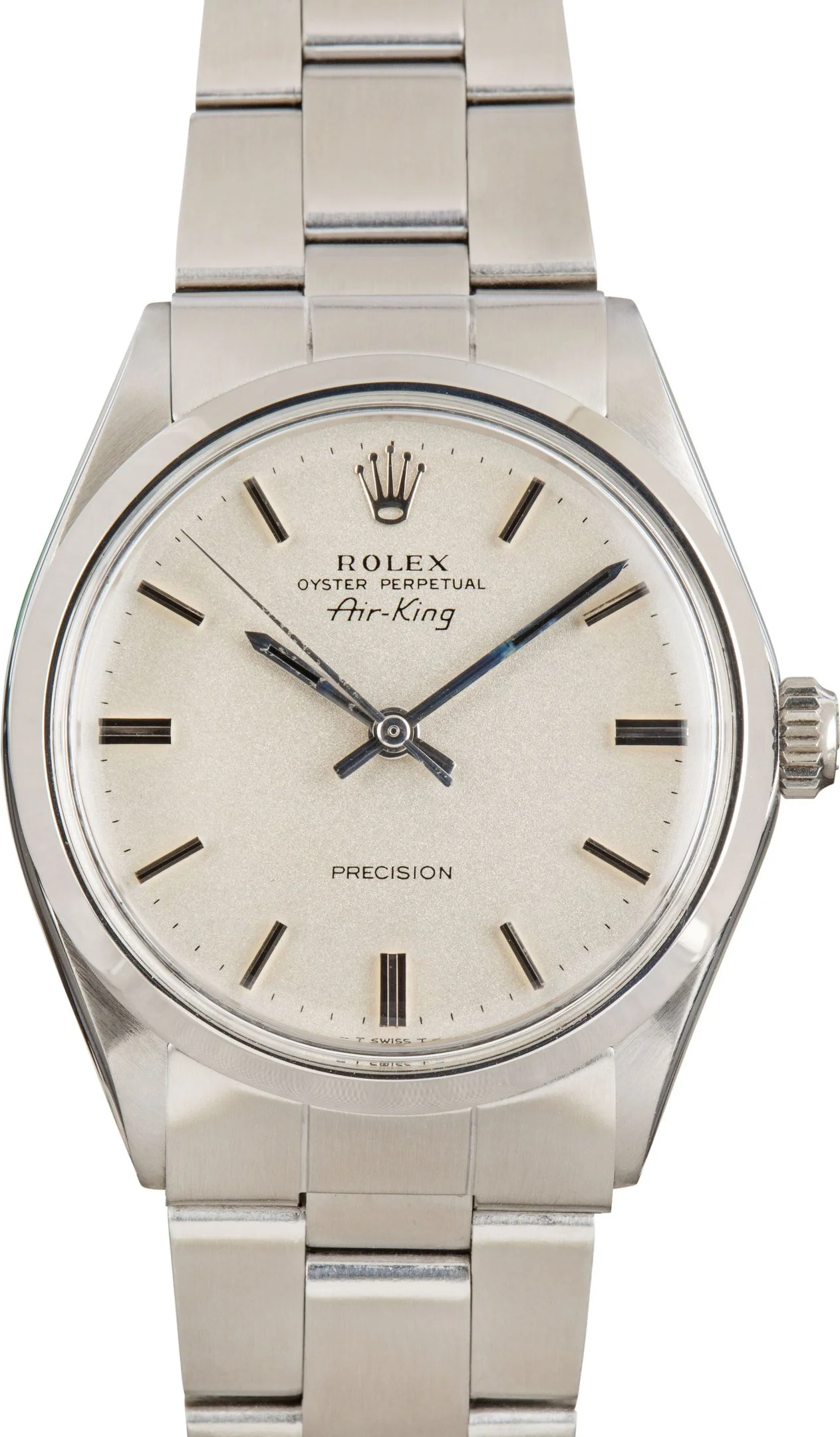 Why We Love This Watch This pre-owned Rolex Air-King ref 5500 (1970) embodies classic vintage style with its 34mm stainless steel case and smooth bezel for a refined, minimalist look. The silver dial with applied index markers provides excellent legibility and timeless elegance. Powered by the reliable Rolex Caliber 1520, this Air-King reflects the simplicity, durability, and enduring appeal that define one of Rolex’s most iconic designs. WATCH DETAILS BRAND Rolex MODEL NAME Air-King MODEL NUMBER 5500 YEAR 1970 ITEM NUMBER 182395 CONDITION Vintage GENDER Mens Womens Unisex BOX & PAPERS No Box or Papers CASE MATERIAL Stainless Steel CRYSTAL Acrylic SIZE 34MM BEZEL Stainless Steel Smooth CASEBACK Solid SERIAL 2281XXX DIAL Silver w/ Index hour markers, Tritium hands & Tritium lume MOVEMENT CALIBRE 1520 TYPE Automatic BEZEL Fixed COMPLICATION No Date BRACELET MATERIAL Stainless Steel TYPE Oyster Fold-Over CLASP Oysterclasp