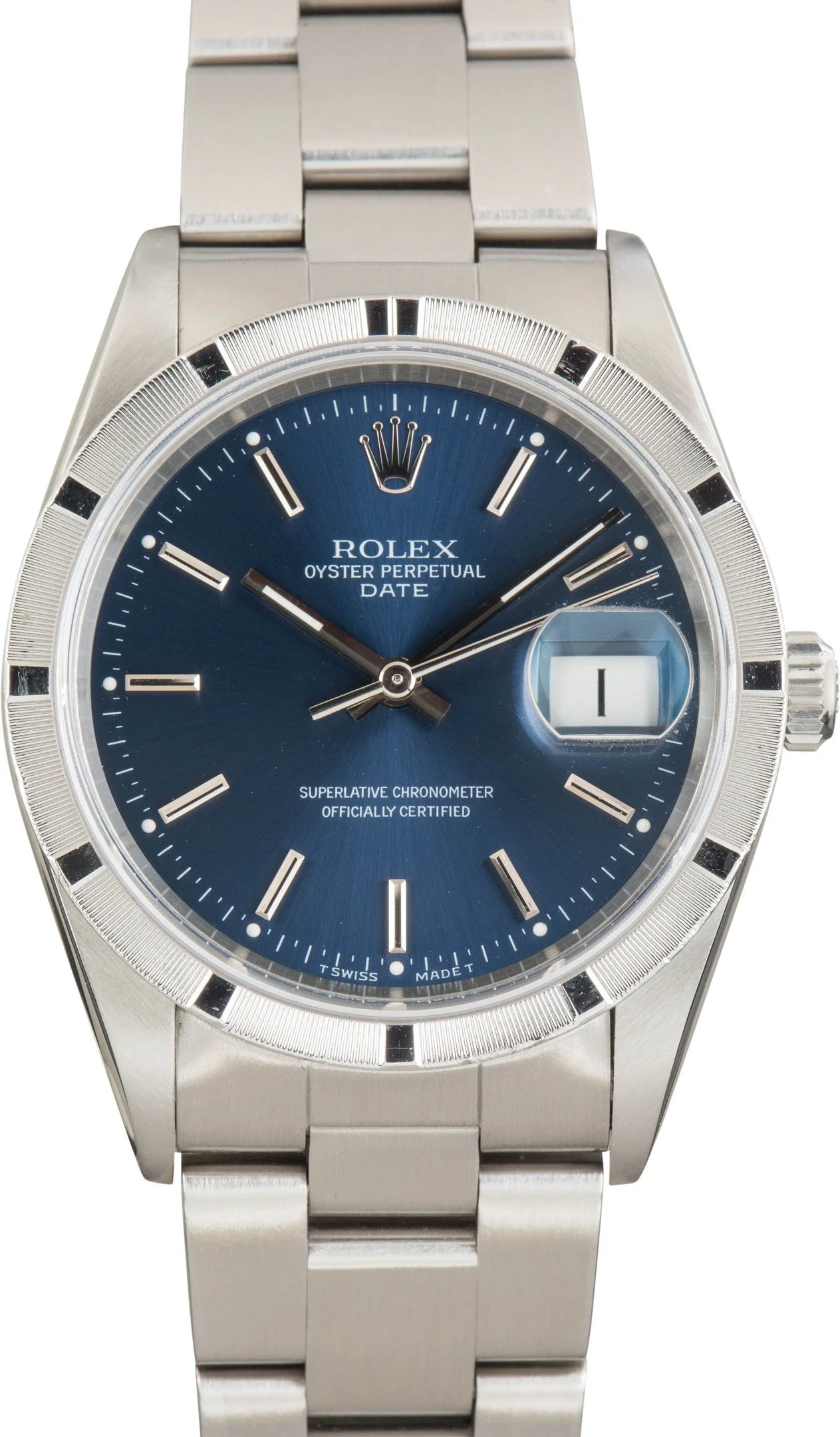 Why We Love This Watch This pre-owned Rolex Date ref. 15210 (1999) pairs classic design with everyday functionality. Its 34 mm stainless steel Oyster case is highlighted by a distinctive engine-turned bezel and a vibrant blue dial with Tritium hands and lume plots. Powered by the reliable Caliber 3135 automatic movement, it delivers precise, dependable performance. Fitted with a stainless steel Oyster bracelet and folding clasp, this Rolex Date combines timeless style, durability, and refined elegance—perfect for both daily wear and collectors. WATCH DETAILS BRAND Rolex MODEL NAME Date MODEL NUMBER 15210 YEAR 1999 ITEM NUMBER 186629 CONDITION Excellent GENDER Mens Womens Unisex BOX & PAPERS Box and Papers CASE MATERIAL Stainless Steel CRYSTAL Sapphire SIZE 34MM BEZEL Stainless Steel Engine Turned CASEBACK Solid SERIAL A185XXX DIAL Blue w/ Index hour markers, Tritium hands & Tritium lume MOVEMENT CALIBRE 3135 TYPE Automatic BEZEL Fixed COMPLICATION Date BRACELET MATERIAL Stainless Steel TYPE Oyster CLASP Oysterclasp