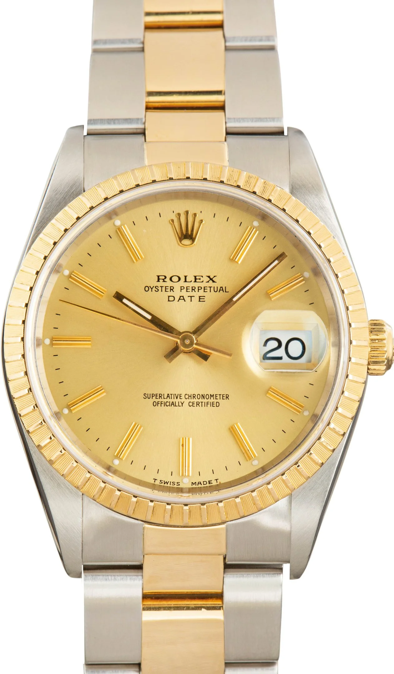 Why We Love This Watch This used Rolex Date ref. 15223 (1996) features a 34mm Oyster case in stainless steel with 18k yellow gold and an engine-turned yellow gold bezel, paired with a champagne dial with Super-LumiNova hands and index hour markers. Powered by the Caliber 3135 automatic movement with a 48-hour power reserve, it offers Chronometer-certified precision, a date function with Cyclops lens at 3 o’clock, and water resistance to 100 meters (330 feet). The watch is completed on a two-tone Oyster bracelet, blending classic Rolex elegance with timeless everyday functionality. WATCH DETAILS BRAND Rolex MODEL NAME Date MODEL NUMBER 15223 YEAR 1996 ITEM NUMBER 185894 CONDITION Excellent GENDER Mens Womens Unisex BOX & PAPERS No Box or Papers CASE MATERIAL Steel and Gold CRYSTAL Sapphire SIZE 34MM BEZEL 18k Yellow Gold Engine Turned CASEBACK Solid SERIAL T938XXX DIAL Champagne w/ Index hour markers, Tritium hands & Tritium lume MOVEMENT CALIBRE 3135 TYPE Automatic BEZEL Fixed COMPLICATION Date BRACELET MATERIAL Two-Tone TYPE Oyster CLASP Oysterclasp