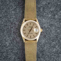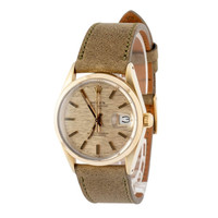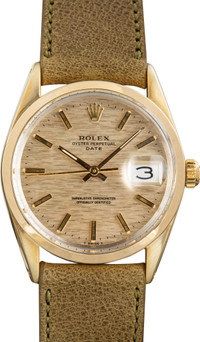 Why We Love This Watch A refined blend of vintage luxury and timeless design, this pre-owned Rolex Date ref. 1550 (1978) embodies distinctive charm. The 14k yellow gold shell case radiates warmth, complemented by a champagne textured index dial that enhances its vintage appeal. A stainless steel caseback ensures durability, while the acrylic crystal adds to its classic character. Presented on a Bob’s Watches leather strap and accompanied by its original Rolex 14k gold shell Oyster bracelet on the side, this manually wound timepiece stands as a testament to Rolex’s enduring craftsmanship and elegance. WATCH DETAILS BRAND Rolex MODEL NAME Date MODEL NUMBER 1550 YEAR 1978 ITEM NUMBER 180451 CONDITION Vintage GENDER Mens Womens Unisex BOX & PAPERS No Box or Papers CASE MATERIAL PVD Yellow Gold CRYSTAL Acrylic SIZE 34MM BEZEL 14k Yellow Gold Smooth CASEBACK Solid SERIAL 5634XXX DIAL Champagne Linen w/ Index hour markers, Tritium hands & Tritium lume MOVEMENT CALIBRE 1570 TYPE Automatic BEZEL Fixed COMPLICATION Date BRACELET MATERIAL Leather TYPE Leather CLASP Tang