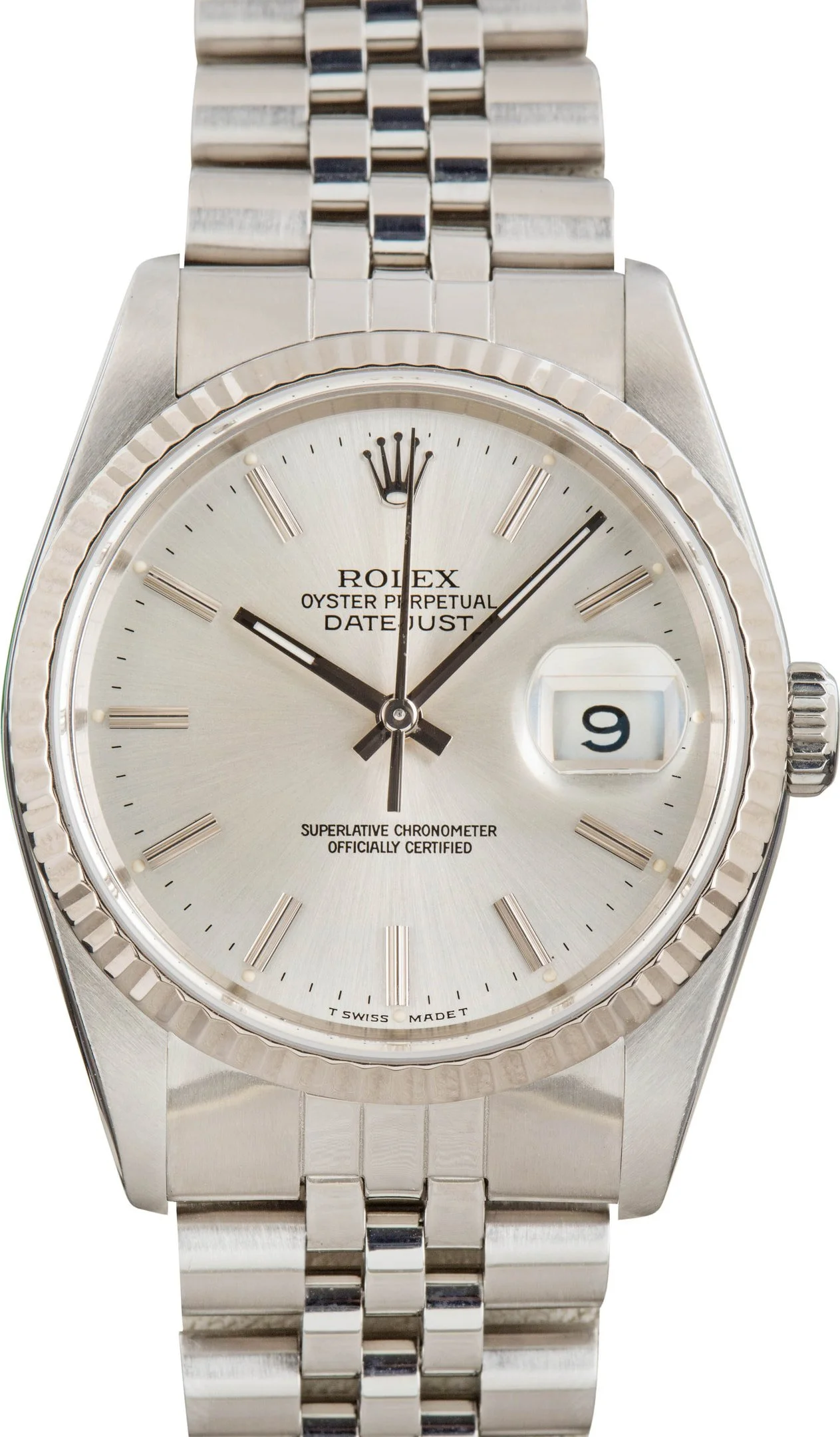 Why We Love This Watch This pre-owned Rolex Datejust 36 ref. 16234 (1993–1994) captures the timeless appeal of Rolex’s classic design. This 36mm stainless steel case is paired with an 18k white gold fluted bezel and a clean silver dial, offering a refined and versatile aesthetic. Fitted with a Jubilee bracelet and powered by a reliable automatic movement, this Datejust delivers precision, comfort, and enduring sophistication—making it a staple choice for both collectors and everyday wearers. WATCH DETAILS BRAND Rolex MODEL NAME Datejust 36 COLLECTION Datejust MODEL NUMBER 16234 YEAR 1994 ITEM NUMBER 185843 CONDITION Excellent GENDER Mens Unisex BOX & PAPERS No Box or Papers CASE MATERIAL Stainless Steel CRYSTAL Sapphire SIZE 36MM BEZEL 18k White Gold Fluted CASEBACK Solid SERIAL S234XXX DIAL Silver w/ Index hour markers, Tritium hands & Tritium lume MOVEMENT CALIBRE 3135 TYPE Automatic BEZEL Fixed COMPLICATION Date BRACELET MATERIAL Stainless Steel TYPE Jubilee CLASP Oysterclasp