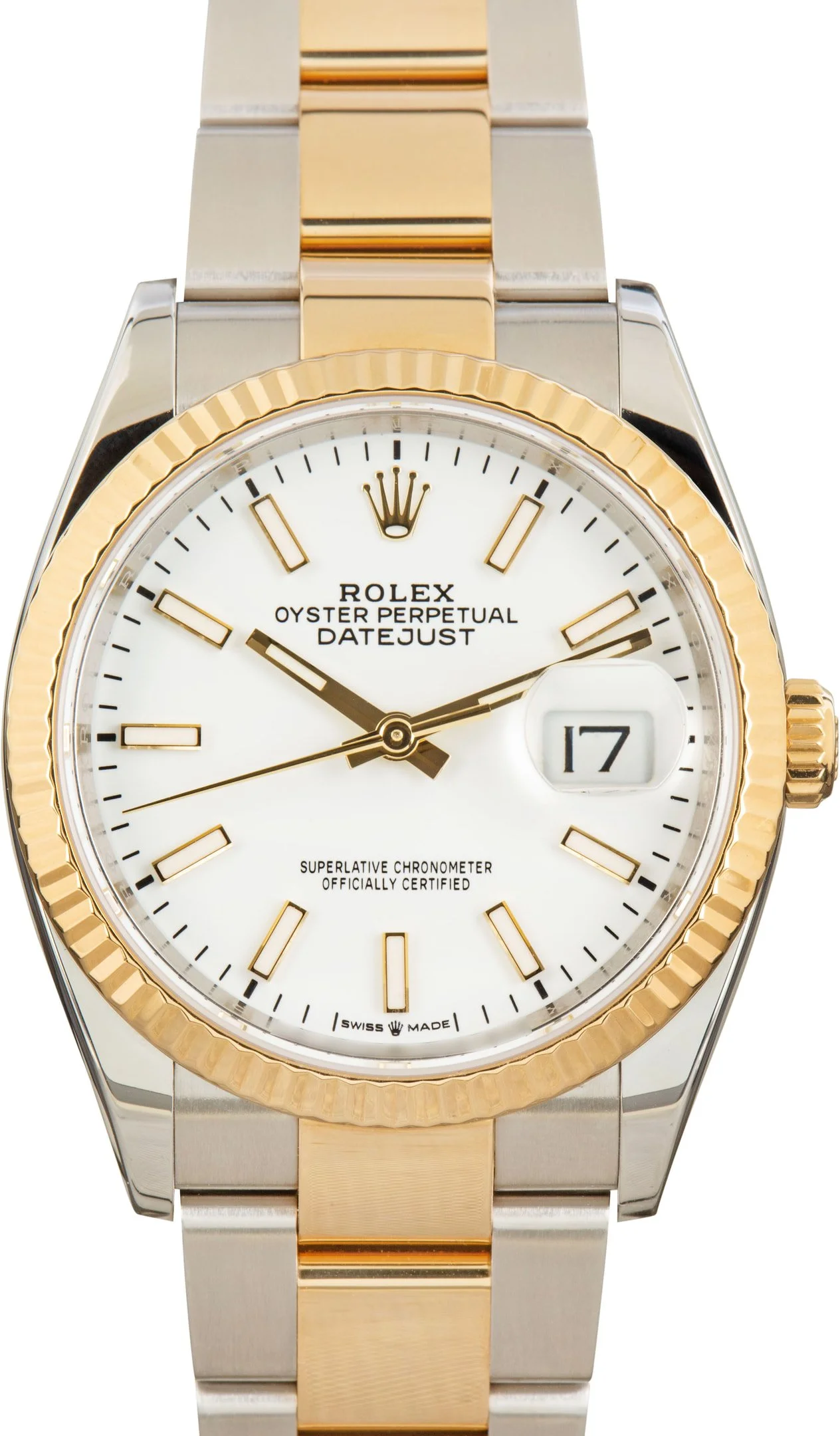 Why We Love This Watch This pre-owned Rolex Datejust ref. 126233 (2019) showcases timeless sophistication with its 36MM stainless steel and 18k yellow gold bezel. Featuring a radiant White index dial for exceptional legibility and paired with the iconic oyster bracelet, this timepiece exudes elegance and versatility. Powered by the Rolex Caliber 3235, it combines precision, durability, and a modern aesthetic, making it a perfect addition to any collection. WATCH DETAILS BRAND Rolex MODEL NAME Datejust 36 COLLECTION Datejust MODEL NUMBER 126233 YEAR 2019 ITEM NUMBER 182671 CONDITION Excellent GENDER Mens Unisex BOX & PAPERS Box and Papers CASE MATERIAL Steel and Gold CRYSTAL Sapphire SIZE 36MM BEZEL 18k Yellow Gold Fluted CASEBACK Solid SERIAL 5KL44XXX DIAL White w/ Index hour markers, Chromalight hands & Chromalight lume MOVEMENT CALIBRE 3235 TYPE Automatic BEZEL Fixed COMPLICATION Date BRACELET MATERIAL Two-Tone TYPE Oyster CLASP Oysterclasp