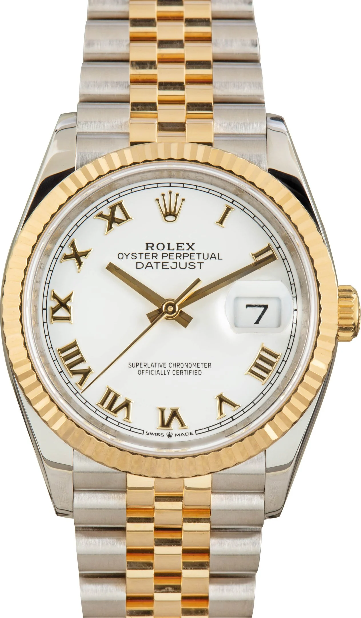 Why We Love This Watch This pre-owned Rolex Datejust ref. 126233 (2018–2025) embodies classic sophistication and enduring style. The 36mm stainless steel and 18k yellow gold case features a fluted bezel and a crisp white Roman numeral dial for a refined, traditional look. Powered by the advanced Rolex Caliber 3235 automatic movement, it delivers precise timekeeping, a 70-hour power reserve, and exceptional reliability. Completed with the iconic two-tone Jubilee bracelet, this Datejust perfectly balances luxury, comfort, and timeless appeal. WATCH DETAILS CREDIT CARD PRICE $14,400.86 BRAND Rolex MODEL NAME Datejust 36 COLLECTION Datejust MODEL NUMBER 126233 ITEM NUMBER 183812 CONDITION Excellent GENDER Mens Unisex BOX & PAPERS No Box or Papers CASE MATERIAL Steel and Gold CRYSTAL Sapphire SIZE 36MM BEZEL 18k Yellow Gold Fluted CASEBACK Solid SERIAL C9A36XXX DIAL White w/ Roman hour markers, Nonluminous hands & Nonluminous lume MOVEMENT CALIBRE 3235 TYPE Automatic BEZEL Fixed COMPLICATION Date BRACELET MATERIAL Two-Tone TYPE Jubilee CLASP Oysterclasp