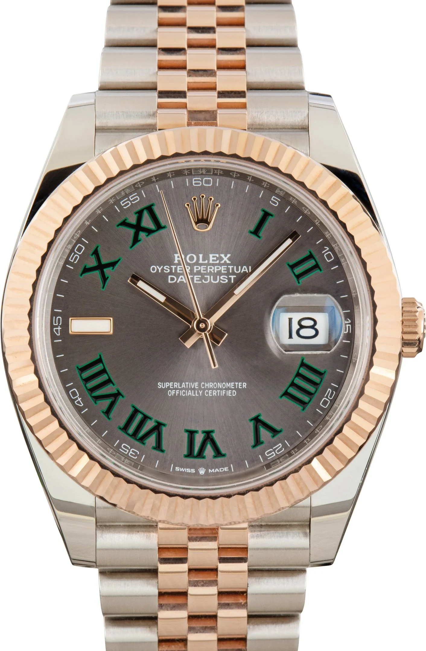 Why We Love This Watch This pre-owned Rolex Datejust 41 ref. 126331 (2016 - 2025). This 41mm Rolesor Everose model pairs Oystersteel with 18k Everose gold and features the distinctive Wimbledon slate dial with green Roman numerals. The watch is fitted with a fluted Everose gold bezel and a Jubilee bracelet, offering both elegance and comfort. Powered by the Calibre 3235 with a 70-hour power reserve and Superlative Chronometer certification, this Datejust combines refined design with exceptional precision and reliability. WATCH DETAILS CREDIT CARD PRICE $18,002.36 BRAND Rolex MODEL NAME Datejust 41 MODEL NUMBER 126331 ITEM NUMBER 184276 CONDITION Excellent GENDER Mens BOX & PAPERS No Box or Papers CASE MATERIAL Steel and Rose Gold CRYSTAL Sapphire SIZE 41MM BEZEL 18k Rose Gold Fluted CASEBACK Solid SERIAL 8S0H1XXX DIAL Slate Wimbledon w/ Roman hour markers, Chromalight hands & Chromalight lume MOVEMENT CALIBRE 3235 TYPE Automatic BEZEL Fixed COMPLICATION Date BRACELET MATERIAL Two-Tone TYPE Jubilee CLASP Oysterclasp