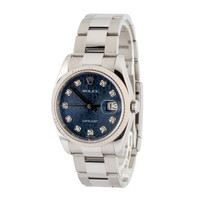 Why We Love This Watch This Rolex Datejust ref 116234 (2005 - 2006) features a 36mm stainless steel case paired with an 18k white gold fluted bezel, offering a perfect balance of elegance and durability. Its blue Jubilee dial is adorned with diamond hour markers, adding a luxurious touch to the classic design. Paired with the iconic Oyster bracelet for comfort and refinement, this timepiece is powered by the Rolex Caliber 3135, ensuring precision and reliability in a timeless style. WATCH DETAILS CREDIT CARD PRICE $10,284.86 BRAND Rolex MODEL NAME Datejust 36 COLLECTION Datejust MODEL NUMBER 116234 YEAR 2006 ITEM NUMBER 180920 CONDITION Excellent GENDER Mens Unisex BOX & PAPERS No Box or Papers CASE MATERIAL Stainless Steel CRYSTAL Sapphire SIZE 36MM BEZEL 18k White Gold Fluted CASEBACK Solid SERIAL D146XXX DIAL Blue Diamonds w/ Diamond hour markers, Nonluminous hands & Nonluminous lume MOVEMENT CALIBRE 3135 TYPE Automatic BEZEL Fixed COMPLICATION Date BRACELET MATERIAL Stainless Steel TYPE Oyster CLASP Oysterclasp