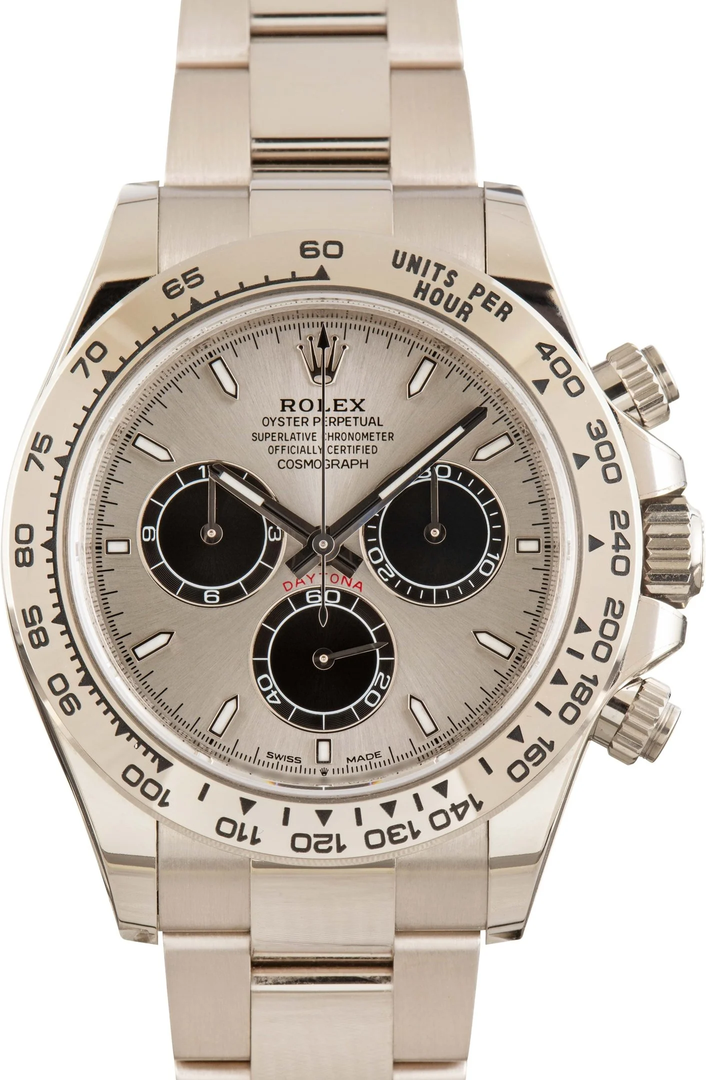 Why We Love This Watch This used Rolex Daytona ref 126509 (2024) features a 40mm 18k white gold case with a tachymeter bezel. This example presents a silver index dial with three contrasting black subdials and is fitted to an Oyster bracelet. Powered by the Caliber 4131, it delivers precision timekeeping with the iconic Daytona racing heritage. WATCH DETAILS CREDIT CARD PRICE $56,075.36 BRAND Rolex MODEL NAME Daytona MODEL NUMBER 126509 YEAR 2024 ITEM NUMBER 184303 CONDITION Excellent GENDER Mens BOX & PAPERS Box and Papers CASE MATERIAL White Gold CRYSTAL Sapphire SIZE 40MM BEZEL 18k White Gold Tachymetric CASEBACK Solid SERIAL 7P88FXXX DIAL Silver w/ Index hour markers, Chromalight hands & Chromalight lume MOVEMENT CALIBRE 4131 TYPE Automatic BEZEL Fixed COMPLICATION Chronograph BRACELET MATERIAL White Gold TYPE Oyster CLASP Oysterlock