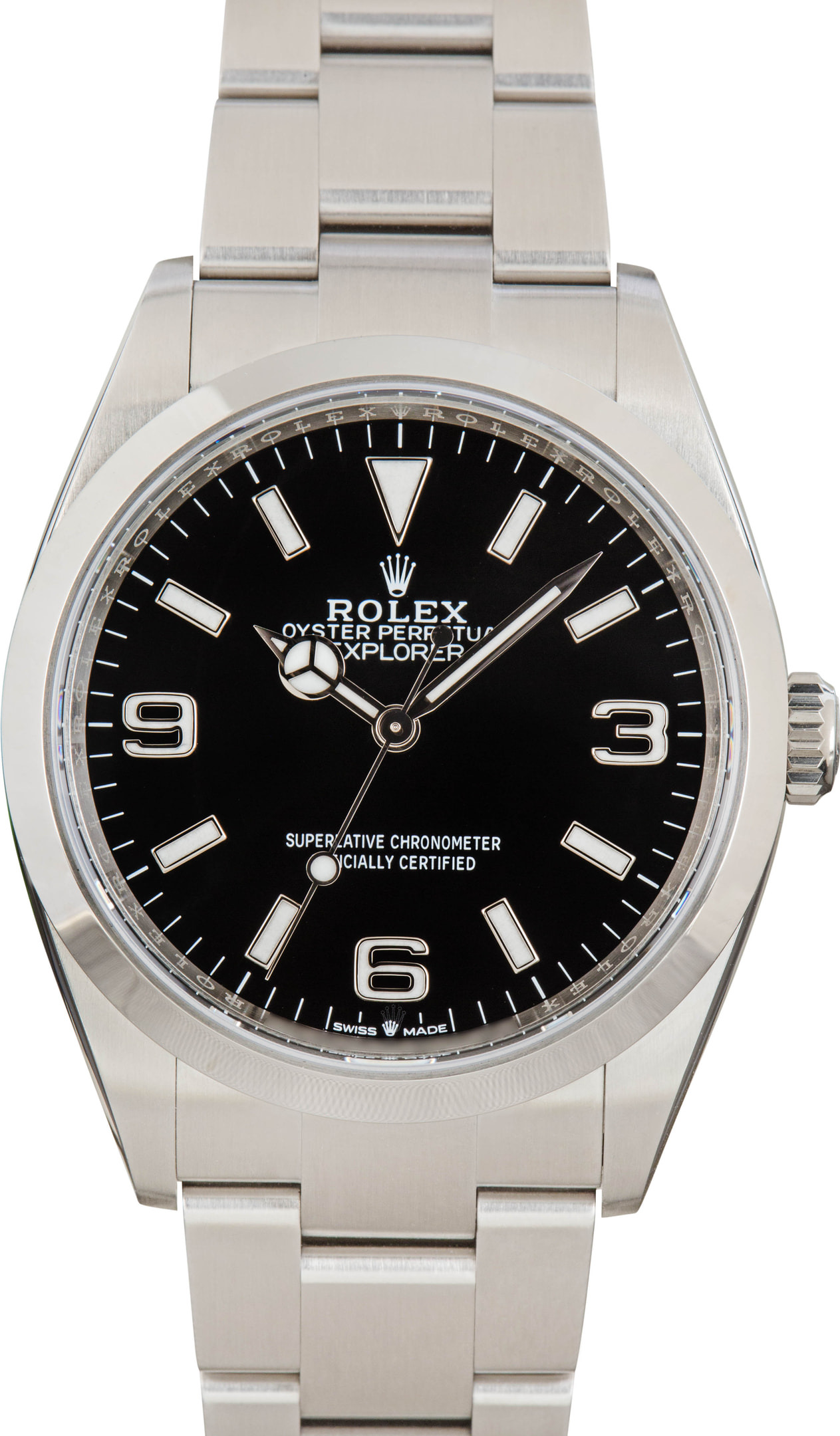 Why We Love This Watch This Rolex Explorer with a black Chromalight dial is a masterclass in adventure-ready style and functionality. Its bold design and luminous clarity make it a top pick for explorers and enthusiasts alike. WATCH DETAILS CREDIT CARD PRICE $9,255.86 BRAND Rolex MODEL NAME Explorer COLLECTION Explorer MODEL NUMBER 124270 YEAR 2021 ITEM NUMBER 181556 CONDITION Excellent GENDER Mens Unisex BOX & PAPERS Box and Papers CASE MATERIAL Stainless Steel CRYSTAL Sapphire SIZE 36MM BEZEL Stainless Steel Smooth CASEBACK Solid SERIAL K08W5XXX DIAL Black w/ Arabic hour markers, Chromalight hands & Chromalight lume MOVEMENT CALIBRE 3230 TYPE Automatic BEZEL Fixed COMPLICATION No Date BRACELET MATERIAL Stainless Steel TYPE Oyster CLASP Oysterclasp
