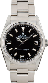Why We Love This Watch We’re impressed by this Rolex Explorer ref 14270 (1999) with its sleek black Arabic dial. Its bold design and rugged durability make it perfect for those who value both style and adventure, embodying timeless functionality. WATCH DETAILS BRAND Rolex MODEL NAME Explorer 36 COLLECTION Explorer MODEL NUMBER 14270 YEAR 1999 ITEM NUMBER 181622 CONDITION Excellent GENDER Mens Unisex BOX & PAPERS No Box or Papers CASE MATERIAL Stainless Steel CRYSTAL Sapphire SIZE 36MM BEZEL Stainless Steel Smooth CASEBACK Solid SERIAL A787XXX DIAL Black w/ Arabic hour markers, Superluminova hands & Superluminova lume MOVEMENT CALIBRE 3131 TYPE Automatic BEZEL Fixed COMPLICATION No Date BRACELET MATERIAL Stainless Steel TYPE Oyster CLASP Oysterclasp