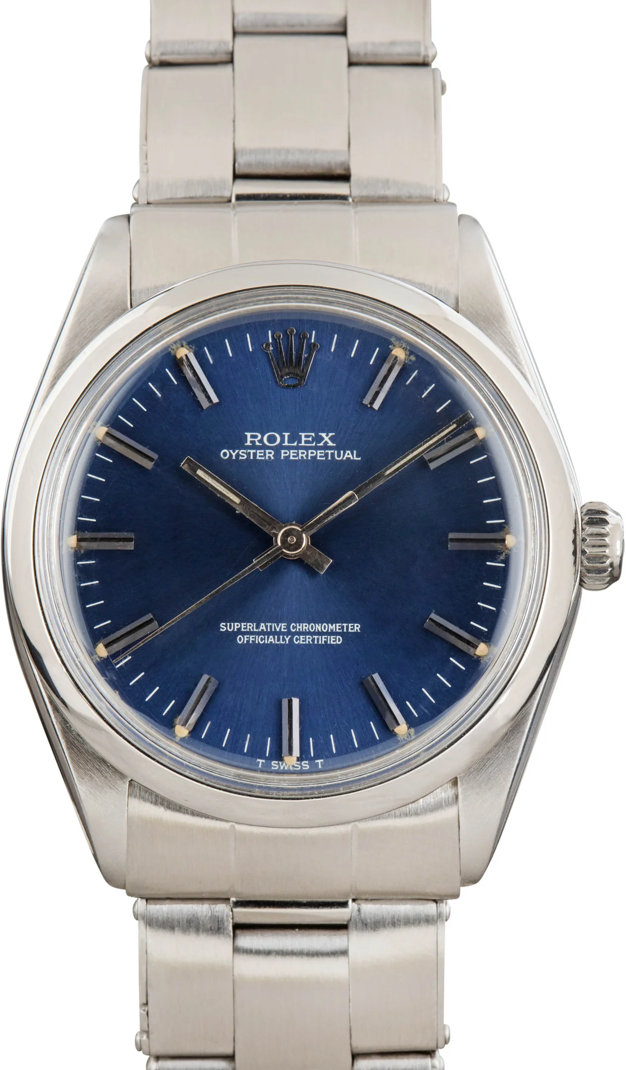 Why We Love This Watch This pre-owned Rolex Oyster Perpetual 34 ref. 1002 (1966). Featuring a 34 mm stainless steel case with a smooth bezel, it houses a vintage blue dial beneath an acrylic crystal, capturing the charm of Rolex’s classic mid-century design. Powered by a reliable automatic movement, it delivers dependable precision and durability. Secured on a stainless steel Oyster rivet bracelet, this Oyster Perpetual 34 blends vintage character, technical reliability, and timeless Rolex craftsmanship — a refined collector’s piece that embodies understated elegance. WATCH DETAILS BRAND Rolex MODEL NAME Oyster Perpetual 34 COLLECTION Oyster Perpetual MODEL NUMBER 1002 YEAR 1966 ITEM NUMBER 174864 CONDITION Vintage GENDER Mens Womens Unisex BOX & PAPERS Box Only CASE MATERIAL Stainless Steel CRYSTAL Acrylic SIZE 34MM BEZEL Stainless Steel Smooth CASEBACK Solid SERIAL 1416XXX DIAL Blue w/ Index hour markers, Tritium hands & Tritium lume MOVEMENT CALIBRE 1570 TYPE Automatic BEZEL Fixed COMPLICATION No Date BRACELET MATERIAL Stainless Steel TYPE Oyster Rivet CLASP Oysterclasp