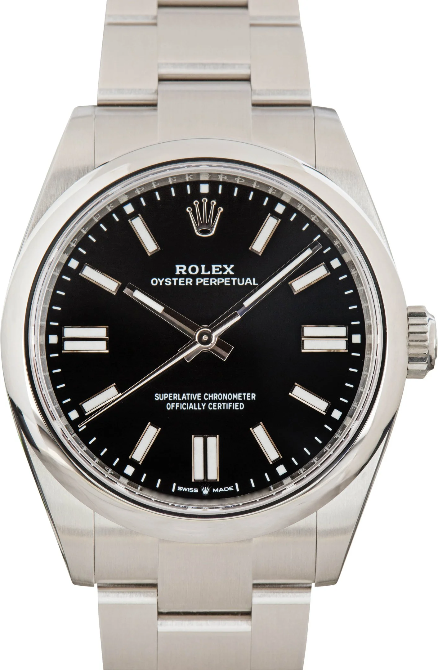 Why We Love This Watch This pre-owned Rolex Oyster Perpetual 41 ref. 134300 (2025) features a 41mm Oystersteel case with a domed bezel and a black dial with Chromalight luminescent hands and hour markers for lasting visibility. Powered by Rolex’s Caliber 3230 automatic movement with a 70-hour power reserve and Superlative Chronometer precision, it delivers reliable and accurate timekeeping. The Oyster bracelet with folding Oysterclasp and Easylink extension ensures comfort and secure fit, while the scratch-resistant sapphire crystal protects the dial. This used Oyster Perpetual 41 combines timeless elegance, modern functionality, and versatile style, making it a standout choice for everyday wear and collectors alike. WATCH DETAILS BRAND Rolex MODEL NAME Oyster Perpetual 41 COLLECTION Oyster Perpetual MODEL NUMBER 134300 YEAR 2025 ITEM NUMBER 184031 CONDITION Excellent GENDER Mens BOX & PAPERS Box and Papers CASE MATERIAL Stainless Steel CRYSTAL Sapphire SIZE 41MM BEZEL Stainless Steel Smooth CASEBACK Solid SERIAL 7SH28XXX DIAL Black w/ Index hour markers, Chromalight hands & Chromalight lume MOVEMENT CALIBRE 3230 TYPE Automatic BEZEL Fixed COMPLICATION No Date BRACELET MATERIAL Stainless Steel TYPE Oyster CLASP Oysterclasp