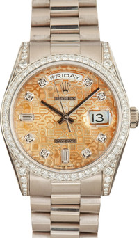 Why We Love This Watch This Rolex Day-Date ref. 118389 (2000–2001) is a captivating timepiece that exudes elegance and character. Crafted from 36mm of 18k white gold, the case features a luxurious diamond-set bezel, adding a touch of brilliance to the classic design. The standout feature is its beautifully patinaed silver jubilee dial, a detail that reflects its age and adds unique warmth and depth to the watch's aesthetic. The dial is adorned with 2 baguette-cut and 8 round diamond hour markers, each meticulously framed in 18k white gold, enhancing its refined allure. WATCH DETAILS CREDIT CARD PRICE $38,582.36 BRAND Rolex MODEL NAME Day-Date 36 MODEL NUMBER 118389 YEAR 2000 - 2001 ITEM NUMBER 168653 CONDITION Excellent GENDER Unisex BOX & PAPERS No Box or Papers CASE MATERIAL White Gold CRYSTAL Sapphire SIZE 36mm BEZEL 18k White Gold Diamond SERIAL K598XXX DIAL Silver w/ Diamond hour markers, Non-Luminous hands & Nonluminous lume MOVEMENT CALIBRE 3155 TYPE Automatic BEZEL Fixed COMPLICATION Date BRACELET MATERIAL White Gold TYPE President CLASP Concealed Crownclasp