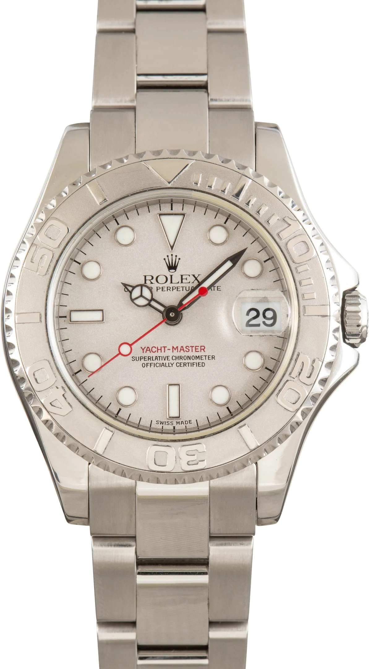 Why We Love This Watch This pre‑owned Rolex Yacht-Master ref. 168622 (2000) is a rare blend of sporty sophistication and timeless refinement. The 35 mm stainless steel case is complemented by a platinum dial and matching platinum bezel, creating an understated yet luxurious presence. Fitted with the classic Oyster bracelet and powered by Rolex’s precise automatic movement, this Yacht-Master delivers exceptional performance, everyday durability, and the adventurous elegance that defines the collection—making it a standout choice for discerning collectors. WATCH DETAILS CREDIT CARD PRICE $9,255.86 BRAND Rolex MODEL NAME Yacht-Master MODEL NUMBER 168622 YEAR 2000 ITEM NUMBER 186182 CONDITION Excellent GENDER Womens Unisex BOX & PAPERS Box and Papers CASE MATERIAL Stainless Steel CRYSTAL Sapphire SIZE 35MM BEZEL Platinum Timing CASEBACK Solid SERIAL P561XXX DIAL Platinum w/ Luminous hour markers, Superluminova hands & Superluminova lume MOVEMENT CALIBRE 2235 TYPE Automatic BEZEL Bidrectional COMPLICATION Date BRACELET MATERIAL Stainless Steel TYPE Oyster CLASP Fliplock