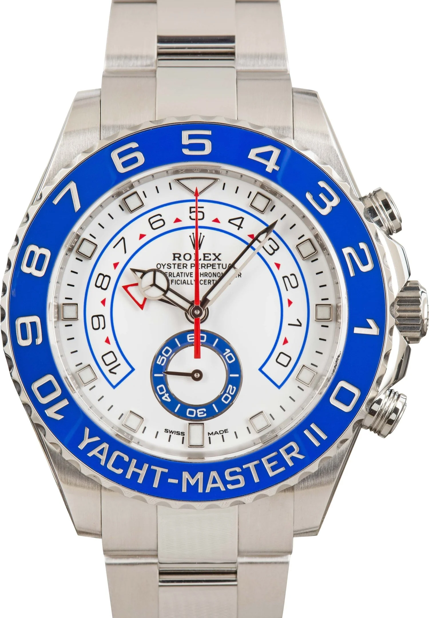 Why We Love This Watch This pre-owned Rolex Yacht-Master II ref. 116680 (2014) is a bold 44 mm stainless steel timepiece, featuring a striking blue Cerachrom bezel and a white Chromalight dial with luminous blue hands and hour markers for exceptional legibility. Designed for regatta timing, this watch includes a programmable countdown with mechanical memory and a flyback function. Fitted with a robust Oyster bracelet, it ensures both comfort and security on the wrist. Powered by Rolex Caliber 4161, this Yacht-Master II delivers precision, reliability, and a commanding presence for sailing enthusiasts and collectors alike. WATCH DETAILS BRAND Rolex MODEL NAME Yacht-Master II COLLECTION Yacht-Master MODEL NUMBER 116680 YEAR 2014 ITEM NUMBER 184344 PL CONDITION Excellent GENDER Mens BOX & PAPERS Box and Papers CASE MATERIAL Stainless Steel CRYSTAL Sapphire SIZE 44MM BEZEL Stainless Steel Ceramic CASEBACK Solid SERIAL 9G617XXX DIAL White w/ Luminous hour markers, Chromalight hands & Chromalight lume MOVEMENT CALIBRE 4161 TYPE Automatic BEZEL Positional COMPLICATION No Date BRACELET MATERIAL Stainless Steel TYPE Oyster CLASP Oysterlock
