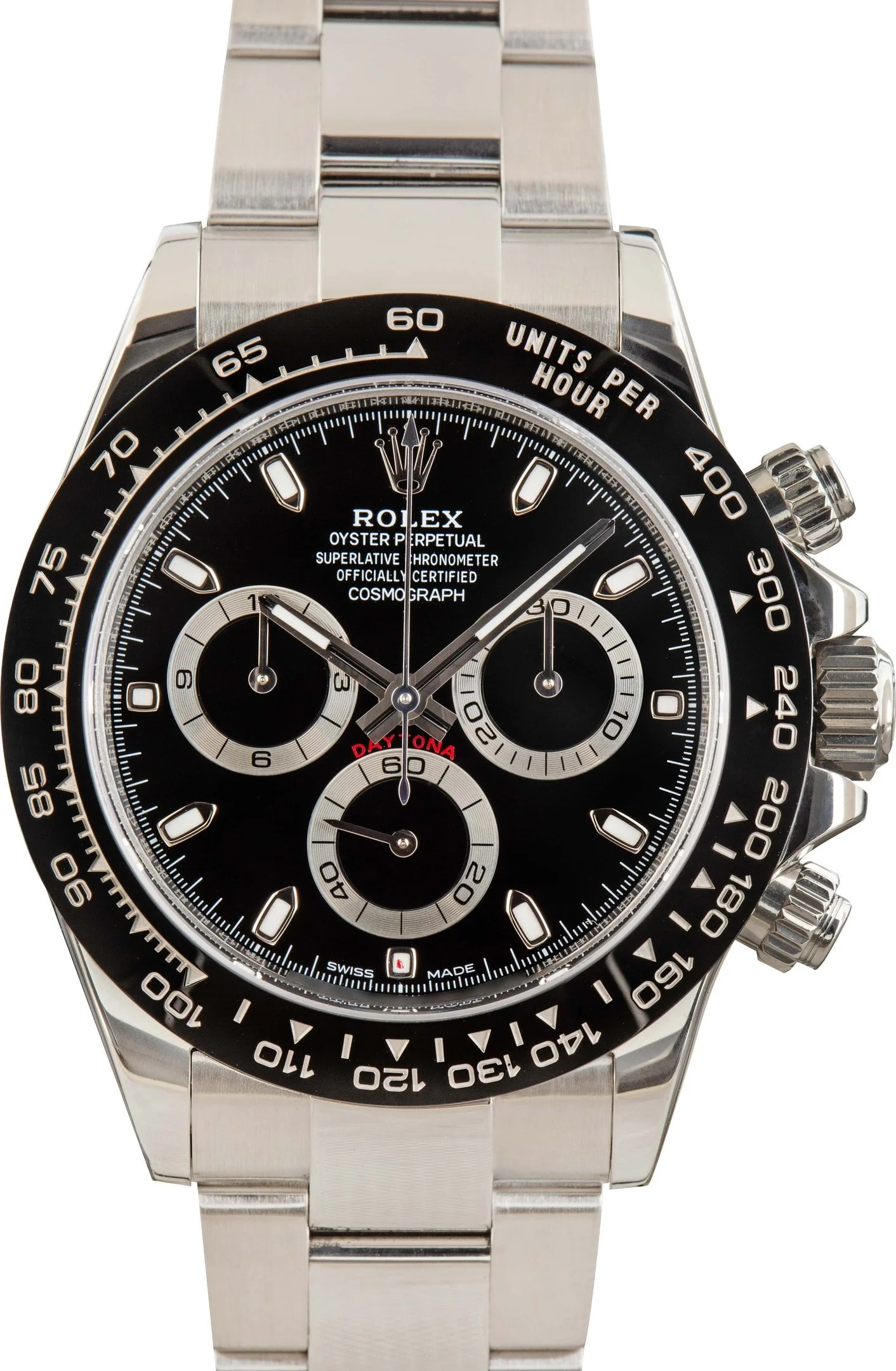 Why We Love This Watch This pre-owned Rolex Daytona ref. 116500 from 2018 showcases the sleek black dial framed by a black Cerachrom tachymeter bezel, giving the iconic chronograph a modern edge. Crafted in 40mm Oystersteel and paired with the robust Oyster bracelet, this model is powered by the self-winding Caliber 4130, renowned for its precision and reliability. A contemporary classic, it blends sporty performance with the timeless prestige of the Daytona name. WATCH DETAILS BRAND Rolex MODEL NAME Daytona MODEL NUMBER 116500 YEAR 2018 ITEM NUMBER 182729 CONDITION Excellent GENDER Mens BOX & PAPERS Box and Papers CASE MATERIAL Stainless Steel CRYSTAL Sapphire SIZE 40MM BEZEL Ceramic Tachymetric CASEBACK Solid SERIAL 35477XXX DIAL Black w/ Index hour markers, Chromalight hands & Chromalight lume MOVEMENT CALIBRE 4130 TYPE Automatic BEZEL Fixed COMPLICATION Chronograph BRACELET MATERIAL Stainless Steel TYPE Oyster CLASP Oysterlock