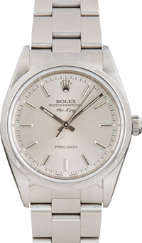Why We Love This Watch This Rolex Air-King ref. 14000 features a 34mm stainless steel case with a smooth bezel and a classic Oyster bracelet. Its clean silver dial offers a timeless, understated look, while the automatic movement provides reliable precision. A versatile and elegant choice, the Air-King embodies Rolex’s signature craftsmanship and enduring style. WATCH DETAILS BRAND Rolex MODEL NAME Air-King MODEL NUMBER 14000 YEAR 1995 ITEM NUMBER 180672 CONDITION Excellent GENDER Mens Womens Unisex BOX & PAPERS No Box or Papers CASE MATERIAL Stainless Steel CRYSTAL Sapphire SIZE 34MM BEZEL Stainless Steel Smooth CASEBACK Solid SERIAL W756XXX DIAL Silver w/ Index hour markers, Tritium hands & Tritium lume MOVEMENT CALIBRE 3000 TYPE Automatic BEZEL Fixed COMPLICATION No Date BRACELET MATERIAL Stainless Steel TYPE Oyster CLASP Oysterclasp