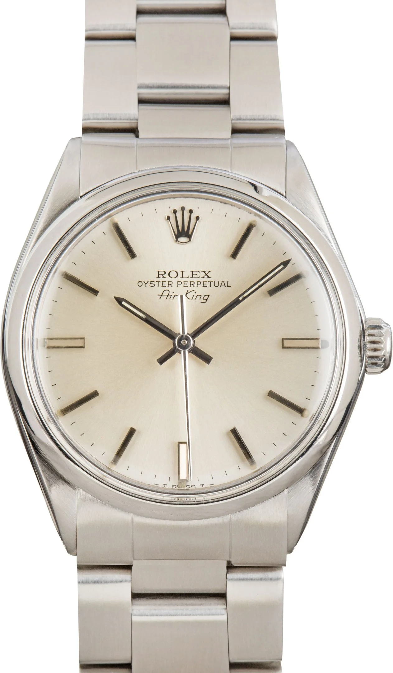 Why We Love This Watch This pre-owned Rolex Air-King ref 5500 (1970) embodies vintage Rolex simplicity with its 34mm stainless steel case, smooth bezel, and silver index dial. Powered by the reliable no-date Caliber 1520 movement, it offers dependable performance and understated charm. Completed with a classic Oyster bracelet, this Air-King remains a timeless example of clean, mid-century Rolex design. WATCH DETAILS BRAND Rolex MODEL NAME Air-King MODEL NUMBER 5500 YEAR 1983 ITEM NUMBER 181094 CONDITION Vintage GENDER Mens Womens Unisex BOX & PAPERS No Box or Papers CASE MATERIAL Stainless Steel CRYSTAL Acrylic SIZE 34MM BEZEL Stainless Steel Smooth CASEBACK Solid SERIAL 2268XXX DIAL Silver w/ Index hour markers, Tritium hands & Tritium lume MOVEMENT CALIBRE 1520 TYPE Automatic BEZEL Fixed COMPLICATION No Date BRACELET MATERIAL Stainless Steel TYPE Oyster CLASP Oysterclasp