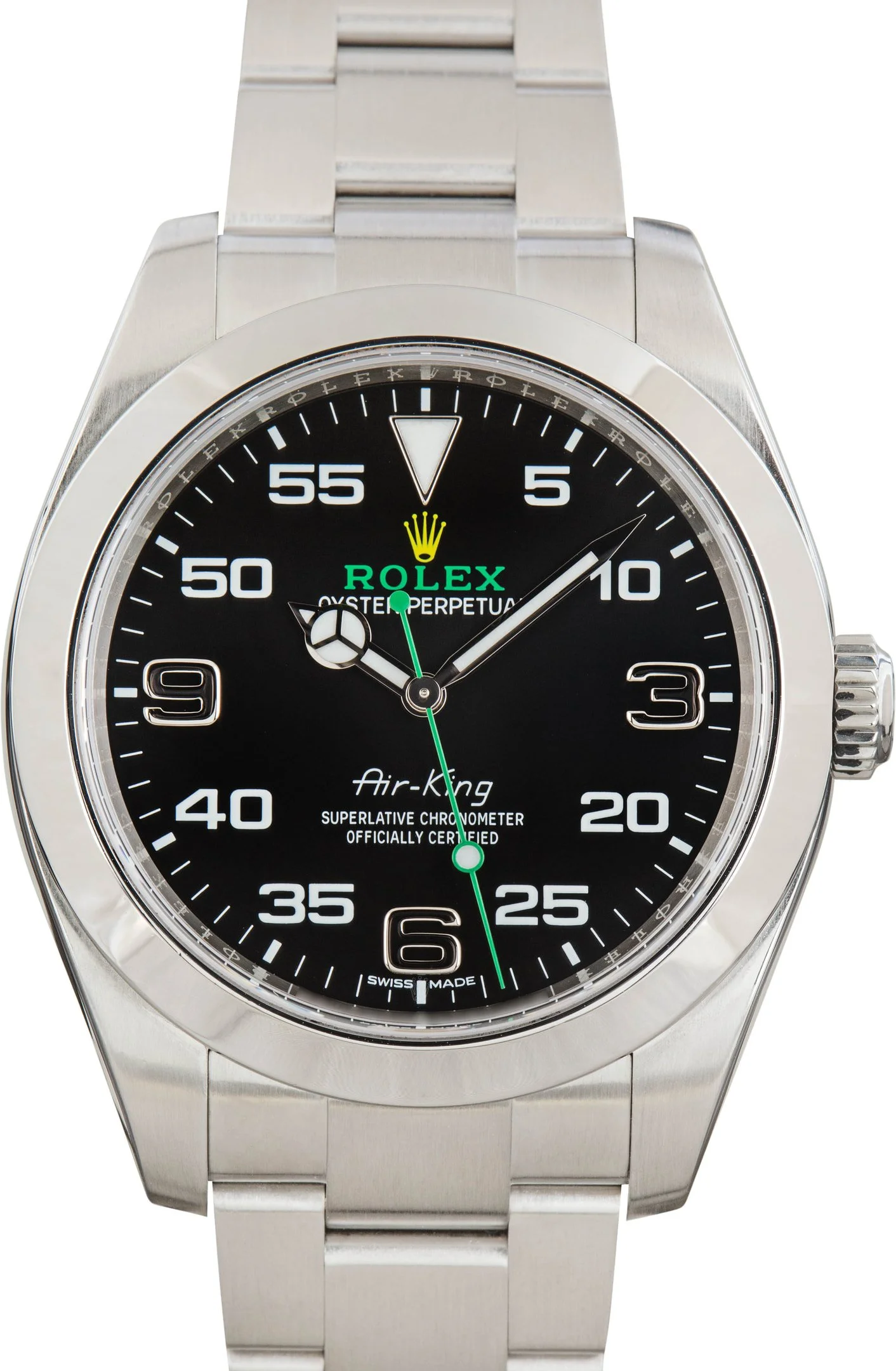 Why We Love This Watch This used Rolex Air-King ref. 116900 (2017) combines aviation-inspired design with contemporary Rolex craftsmanship. Its 40mm Oystersteel case showcases a smooth bezel and striking black dial, accented by a green seconds hand and the iconic yellow Rolex crown. Driven by the anti-magnetic Caliber 3131 with a 48-hour power reserve and secured on an Oyster bracelet with Easylink clasp, this Air-King offers both reliability and bold, sporty character. Water-resistant to 100 meters, it’s a statement of precision and style. WATCH DETAILS BRAND Rolex MODEL NAME Air-King MODEL NUMBER 116900 YEAR 2017 ITEM NUMBER 184173 CONDITION Excellent GENDER Mens BOX & PAPERS No Box or Papers CASE MATERIAL Stainless Steel CRYSTAL Sapphire SIZE 40MM BEZEL Stainless Steel Smooth CASEBACK Solid SERIAL G09X0XXX DIAL Black w/ Arabic hour markers, Chromalight hands & Chromalight lume MOVEMENT CALIBRE 3131 TYPE Automatic BEZEL Fixed COMPLICATION No Date BRACELET MATERIAL Stainless Steel TYPE Oyster CLASP Oysterclasp