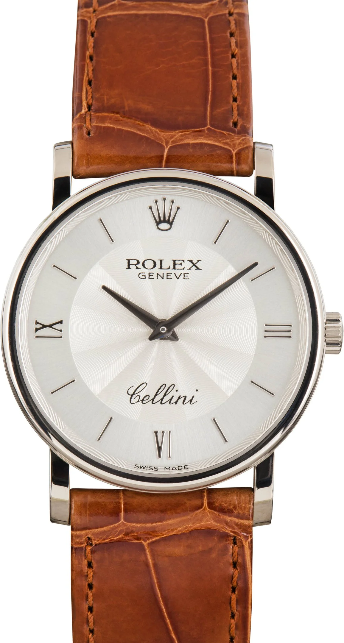 Why We Love This Watch This pre-owned Rolex Cellini ref 5115 (2007–2008) reflects classic dress-watch elegance with a refined silver dial and a clean smooth bezel. The case is paired with a genuine Rolex leather strap and original Rolex tang buckle, maintaining a timeless and understated profile. Powered by a manual-wind movement, this Cellini emphasizes traditional watchmaking and understated sophistication, making it an ideal choice for formal and everyday wear alike. WATCH DETAILS CREDIT CARD PRICE $6,477.56 BRAND Rolex MODEL NAME Cellini MODEL NUMBER 5115 YEAR 2008 ITEM NUMBER 184049 CONDITION Excellent GENDER Womens Unisex BOX & PAPERS No Box or Papers CASE MATERIAL White Gold CRYSTAL Sapphire SIZE 32MM BEZEL 18k White Gold Smooth CASEBACK Solid SERIAL M766XXX DIAL Silver w/ Roman hour markers, Nonluminous hands & Nonluminous lume MOVEMENT TYPE Manual BEZEL Fixed COMPLICATION No Date BRACELET MATERIAL Leather TYPE Rolex Leather Strap CLASP Rolex Tang Buckle