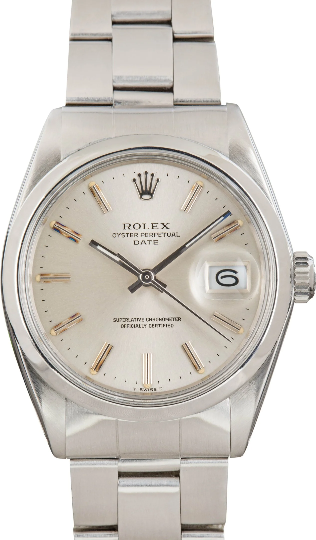 Why We Love This Watch This early-Date classic features a clean silver dial, smooth bezel, and vintage acrylic crystal that captures the charm of 1960s Rolex design. The stainless steel case is paired with an Oyster foldover bracelet, offering a timeless look with everyday wearability—an ideal piece for collectors who appreciate true vintage character. WATCH DETAILS CREDIT CARD PRICE $5,139.86 BRAND Rolex MODEL NAME Date MODEL NUMBER 1500 YEAR 1963 ITEM NUMBER 180933 CONDITION Vintage GENDER Mens Womens Unisex BOX & PAPERS No Box or Papers CASE MATERIAL Stainless Steel CRYSTAL Acrylic SIZE 34MM BEZEL Stainless Steel Engine Turned CASEBACK Solid SERIAL 858XXX DIAL Silver w/ Index hour markers, Tritium hands & Tritium lume MOVEMENT CALIBRE 1570 TYPE Automatic BEZEL Fixed COMPLICATION Date BRACELET MATERIAL Stainless Steel TYPE Oyster Fold-Over CLASP Oysterclasp