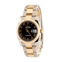 Why We Love This Watch This Rolex Datejust ref. 116203 (2005–2006) presents a balanced blend of sporty elegance and classic design in a 36mm stainless steel case accented by an 18k yellow gold smooth bezel. The black dial features applied gold Roman numerals, offering strong contrast and a refined aesthetic. Paired with a two-tone Oyster bracelet, this model carries a solid wrist presence without being flashy. Powered by the workhorse caliber 3135, it combines Rolex’s trusted performance with an understated, luxurious touch that remains versatile across both formal and casual settings. WATCH DETAILS BRAND Rolex MODEL NAME Datejust 36 MODEL NUMBER 116203 YEAR 2006 ITEM NUMBER 172237 CONDITION Excellent GENDER Mens Unisex BOX & PAPERS Box Only CASE MATERIAL Steel and Gold CRYSTAL Sapphire SIZE 36MM BEZEL 18k Yellow Gold Smooth SERIAL D343XXX DIAL Black w/ Roman hour markers, Nonluminous hands & Nonluminous lume MOVEMENT CALIBRE 3135 TYPE Automatic BEZEL Fixed COMPLICATION Date BRACELET MATERIAL Two-Tone TYPE Oyster CLASP Oysterclasp