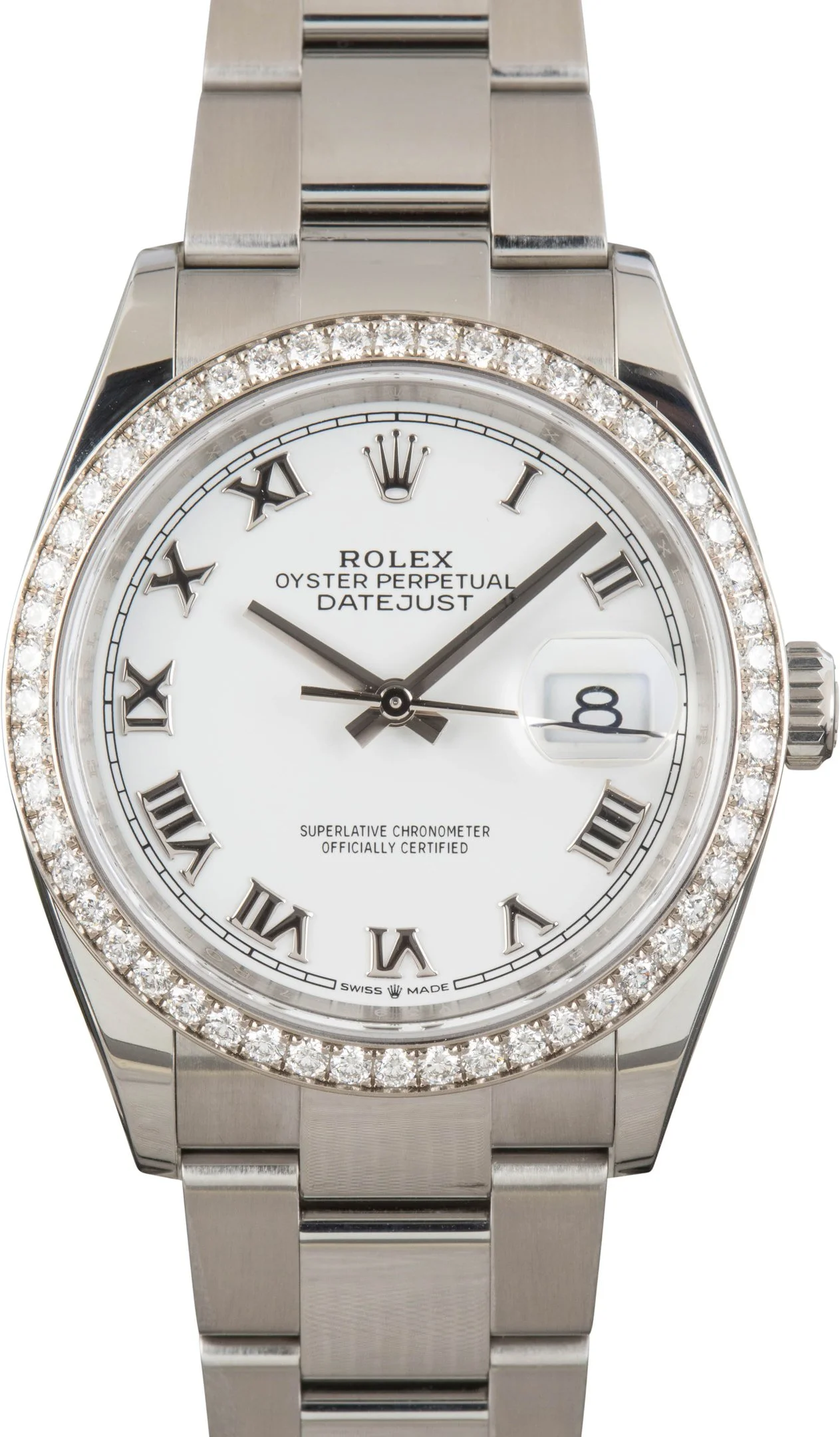 Why We Love This Watch This Rolex Datejust ref. 126284 (2019) features a 36mm stainless steel case with a diamond-set bezel surrounded in 18k white gold. The white Roman dial adds a refined, classic touch, while the Oyster bracelet ensures a secure and comfortable fit. Powered by the Caliber 3235 automatic movement, this Datejust delivers precision and timeless Rolex elegance. WATCH DETAILS CREDIT CARD PRICE $20,574.86 BRAND Rolex MODEL NAME Datejust 36 COLLECTION Datejust MODEL NUMBER 126284 YEAR 2019 ITEM NUMBER 182833 CONDITION Excellent GENDER Mens Unisex BOX & PAPERS Box and Papers CASE MATERIAL Stainless Steel CRYSTAL Sapphire SIZE 36MM BEZEL 18k White Gold Diamond CASEBACK Solid SERIAL OFV39XXX DIAL White w/ Roman hour markers, Non-Luminous hands & Nonluminous lume MOVEMENT CALIBRE 3235 TYPE Automatic BEZEL Fixed COMPLICATION Date BRACELET MATERIAL Stainless Steel TYPE Oyster CLASP Oysterclasp