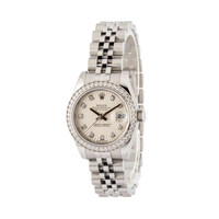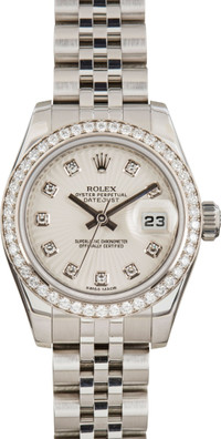 Why We Love This Watch This used Rolex Lady-Datejust 179384 features a 26 mm stainless steel case with a white gold bezel set with 46 diamonds and a silver dial with diamond hour markers. Powered by the automatic Caliber 2235 movement with a ~48‑hour power reserve, it delivers reliable precision. Completing this elegant piece is a stainless steel Jubilee bracelet with a concealed folding Crownclasp, along with a sapphire crystal with Cyclops lens, screw-down crown, and 100 m (330 ft) water resistance. WATCH DETAILS BRAND Rolex MODEL NAME Lady Datejust COLLECTION Datejust MODEL NUMBER 179384 YEAR 2010 ITEM NUMBER 182116 CONDITION Excellent GENDER Womens BOX & PAPERS No Box or Papers CASE MATERIAL Stainless Steel CRYSTAL Sapphire SIZE 26MM BEZEL 18k White Gold Diamond CASEBACK Solid SERIAL G405XXX DIAL Silver Diamond w/ Diamond hour markers, Nonluminous hands & Nonluminous lume MOVEMENT CALIBRE 2235 TYPE Automatic BEZEL Fixed COMPLICATION Date BRACELET MATERIAL Stainless Steel TYPE Jubilee CLASP Concealed folding Crownclasp