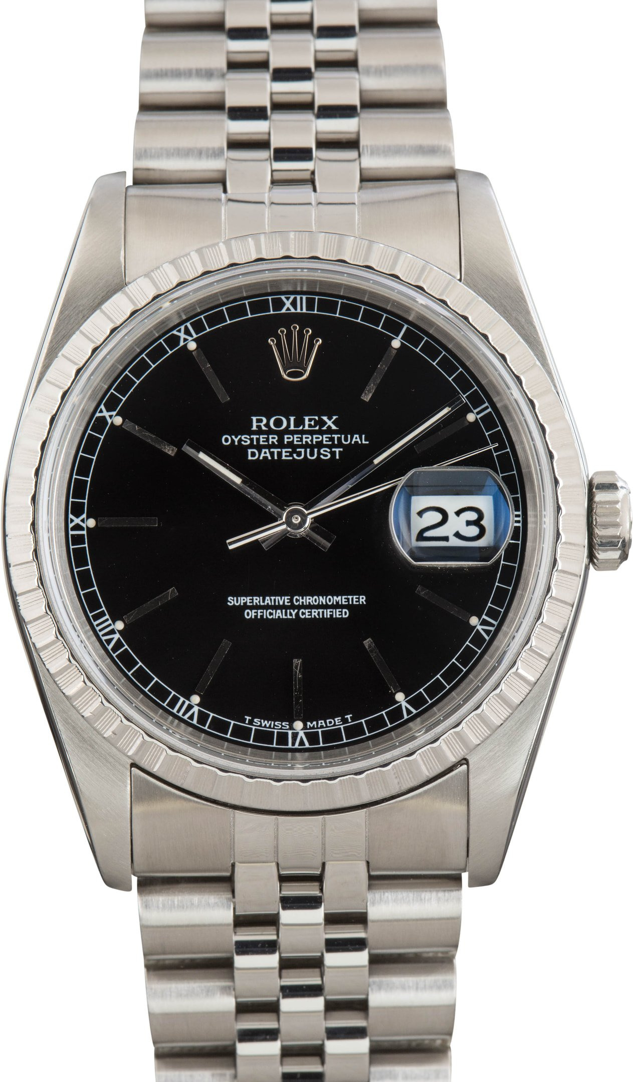 Why We Love This Watch This pre-owned Rolex Datejust 36 ref. 16220 (1989) features a classic 36mm stainless steel case paired with a striking black dial with index hour markers. An engine-turned bezel adds vintage character, while the Jubilee bracelet delivers comfortable, timeless wear. Power comes from the reliable Rolex Caliber 3135 automatic movement, known for durability, precision, and everyday versatility. WATCH DETAILS CREDIT CARD PRICE $6,992.06 BRAND Rolex MODEL NAME Datejust 36 COLLECTION Datejust MODEL NUMBER 16220 YEAR 1989 ITEM NUMBER 184546 CONDITION Excellent GENDER Mens Unisex BOX & PAPERS No Box or Papers CASE MATERIAL Stainless Steel CRYSTAL Sapphire SIZE 36MM BEZEL Stainless Steel Engine Turned CASEBACK Solid SERIAL L242XXX DIAL Black w/ Index hour markers, Tritium hands & Tritium lume MOVEMENT CALIBRE 3135 TYPE Automatic BEZEL Fixed COMPLICATION Date BRACELET MATERIAL Stainless Steel TYPE Jubilee CLASP Oysterclasp