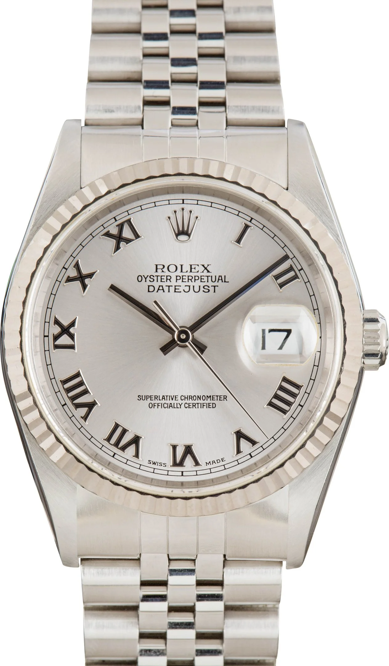 Why We Love This Watch This pre-owned Rolex Datejust 36 ref 16234. A classic 36 mm stainless steel Rolex Datejust featuring an 18K white gold fluted bezel and a comfortable Jubilee bracelet, powered by Rolex’s reliable Caliber 3135 automatic chronometer-rated movement with a quick-set date at 3 o’clock under a sapphire crystal with Cyclops magnifier — timeless design and precision engineered for everyday wear. WATCH DETAILS CREDIT CARD PRICE $7,403.66 BRAND Rolex MODEL NAME Datejust 36 COLLECTION Datejust MODEL NUMBER 16234 YEAR 2000 ITEM NUMBER 184333 CONDITION Excellent GENDER Mens Unisex BOX & PAPERS Box and Papers CASE MATERIAL Stainless Steel CRYSTAL Sapphire SIZE 36MM BEZEL 18k White Gold Fluted CASEBACK Solid SERIAL P946XXX DIAL Rhodium w/ Roman hour markers, Nonluminous hands & Nonluminous lume MOVEMENT CALIBRE 3135 TYPE Automatic BEZEL Fixed COMPLICATION Date BRACELET MATERIAL Stainless Steel TYPE Jubilee CLASP Oysterclasp