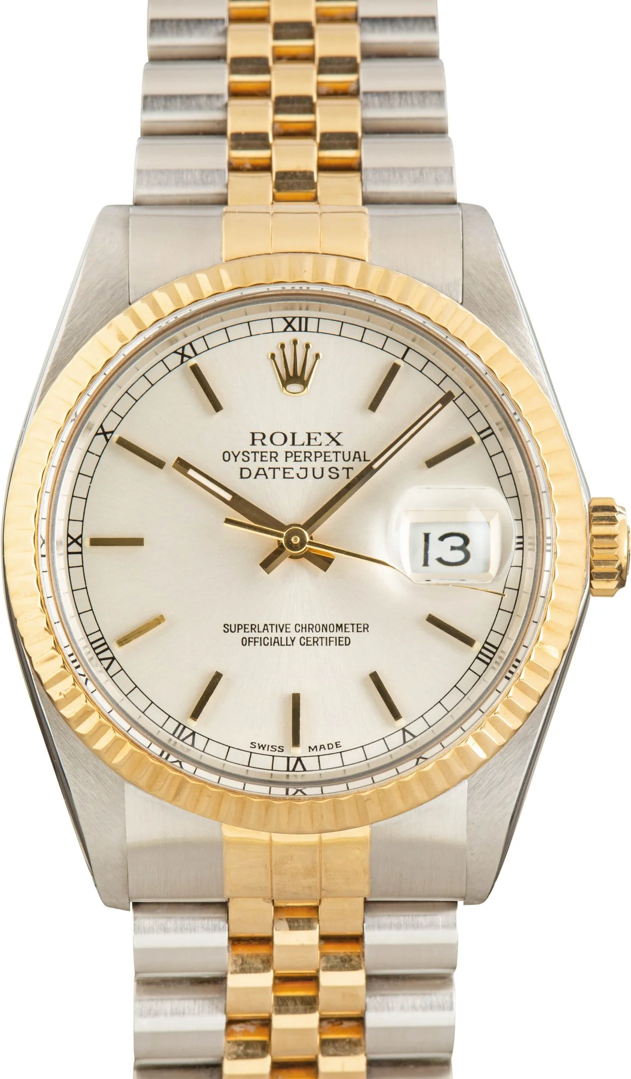 Why We Love This Watch Pre-owned Rolex Datejust 36 ref. 16013 (1987) features a classic silver service dial with matching service hands, paired with a fluted bezel and iconic Jubilee bracelet. Crafted in stainless steel and 18k yellow gold, this timeless 36 mm configuration embodies enduring Rolex elegance, making it a versatile choice for both everyday wear and refined occasions. WATCH DETAILS CREDIT CARD PRICE $7,094.96 BRAND Rolex MODEL NAME Datejust 36 COLLECTION Datejust MODEL NUMBER 16013 YEAR 1987 ITEM NUMBER 184337 CONDITION Excellent GENDER Mens Unisex BOX & PAPERS No Box or Papers CASE MATERIAL Steel and Gold CRYSTAL Acrylic SIZE 36MM BEZEL 18k Yellow Gold Fluted CASEBACK Solid SERIAL 9616XXX DIAL Silver w/ Index hour markers, Luminous hands & Luminous lume MOVEMENT CALIBRE 3035 TYPE Automatic BEZEL Fixed COMPLICATION Date BRACELET MATERIAL Two-Tone TYPE Jubilee CLASP Foldover