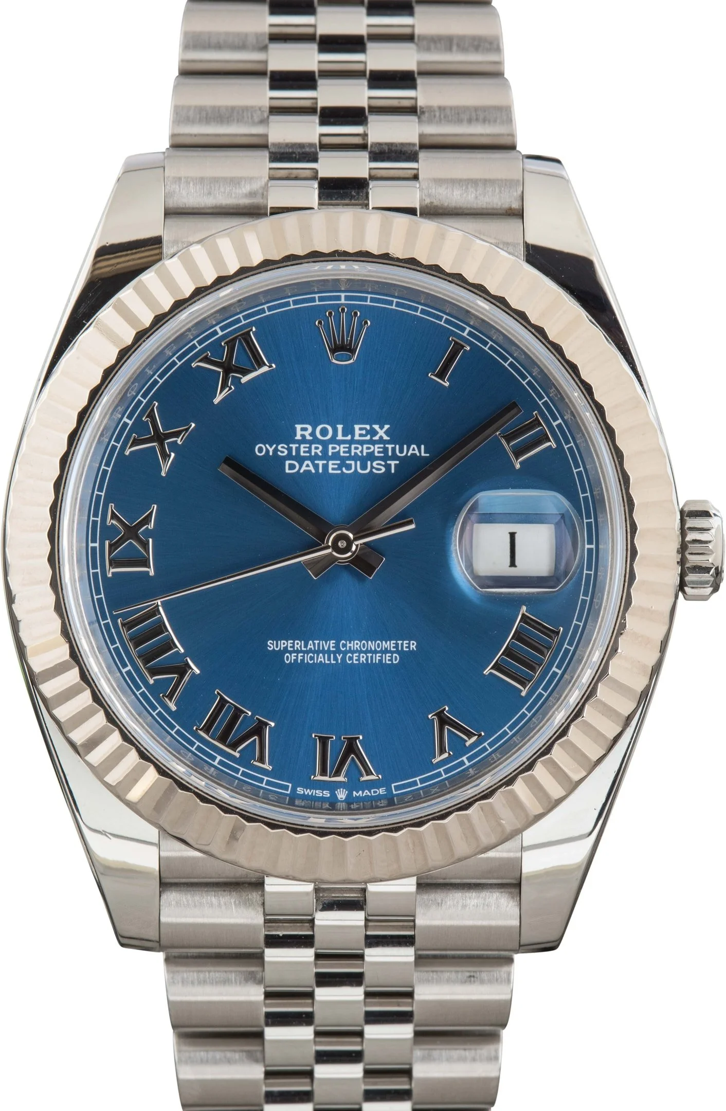 Why We Love This Watch This pre-owned Rolex Datejust 41 ref. 126334 (2023) features a striking blue Roman dial paired with a classic fluted bezel for a bold yet refined look. Crafted in stainless steel with white gold accents, the 41mm case is complemented by a comfortable Jubilee bracelet. A modern classic with timeless style, this Datejust combines everyday wearability with iconic Rolex sophistication. WATCH DETAILS CREDIT CARD PRICE $15,738.56 BRAND Rolex MODEL NAME Datejust 41 MODEL NUMBER 126334 YEAR 2023 ITEM NUMBER 184885 PL CONDITION Excellent GENDER Mens BOX & PAPERS Box and Papers CASE MATERIAL Stainless Steel CRYSTAL Sapphire SIZE 41MM BEZEL 18k White Gold Fluted CASEBACK Solid SERIAL G3814XXX DIAL Blue w/ Roman hour markers, Nonluminous hands & Nonluminous lume MOVEMENT CALIBRE 3235 TYPE Automatic BEZEL Fixed COMPLICATION Date BRACELET MATERIAL Stainless Steel TYPE Jubilee CLASP Oysterclasp