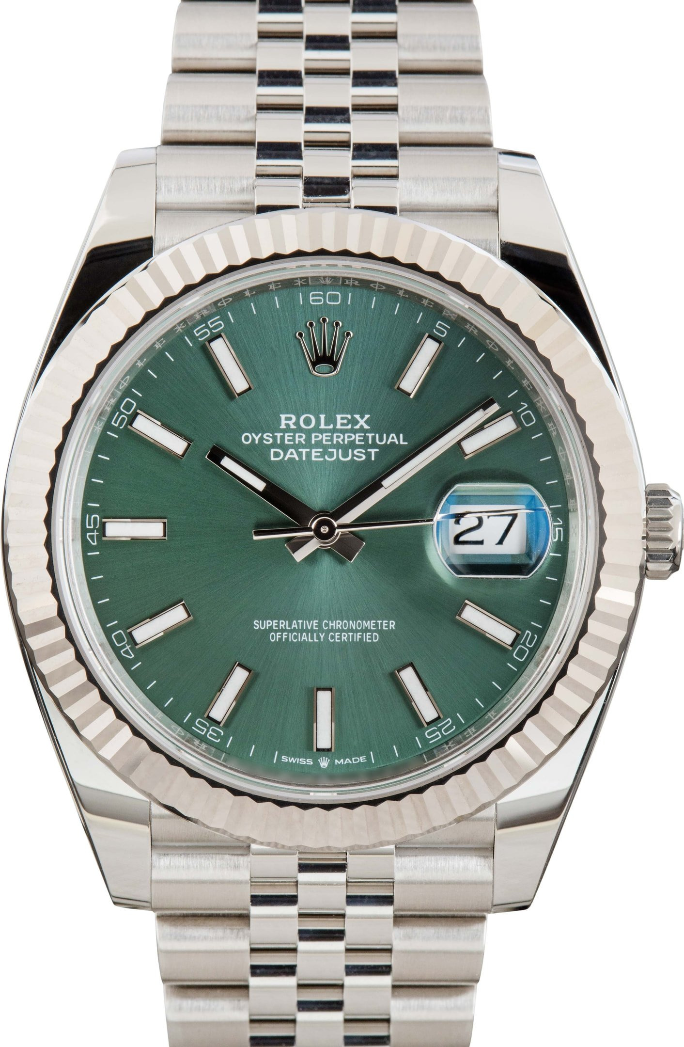 Why We Love This Watch This pre-owned Rolex Datejust 41 ref. 126334 (2025) showcases a striking mint green dial that brings a fresh, modern touch to its classic 41mm stainless steel design. The white gold fluted bezel adds refined brilliance, while the Jubilee bracelet enhances comfort and elegance. Complete with box and papers, this Datejust pairs Rolex’s renowned precision with standout style—an exceptional addition for any discerning collector. WATCH DETAILS BRAND Rolex MODEL NAME Datejust 41 MODEL NUMBER 126334 YEAR 2025 ITEM NUMBER 184395 PL CONDITION Excellent GENDER Mens BOX & PAPERS Box and Papers CASE MATERIAL Stainless Steel CRYSTAL Sapphire SIZE 41MM BEZEL 18k White Gold Fluted CASEBACK Solid SERIAL 52E35XXX DIAL Mint Green w/ Index hour markers, Chromalight hands & Chromalight lume MOVEMENT CALIBRE 3235 TYPE Automatic BEZEL Fixed COMPLICATION Date BRACELET MATERIAL Stainless Steel TYPE Jubilee CLASP Oysterclasp