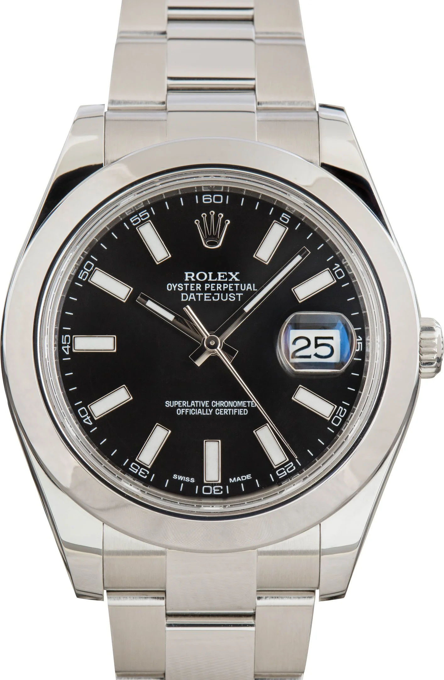 Why We Love This Watch This pre-owned Rolex Datejust II ref. 116300 (2017) delivers bold, modern styling with its sleek black dial and Super-LumiNova luminescent hands and markers. Its 41mm stainless steel case and Oyster bracelet offer a perfect balance of durability and refined presence on the wrist. Powered by the reliable Caliber 3136 automatic movement, this modern Datejust brings precision, versatility, and understated elegance to everyday wear. WATCH DETAILS BRAND Rolex MODEL NAME Datejust II MODEL NUMBER 116300 YEAR 2017 ITEM NUMBER 183738 CONDITION Excellent GENDER Mens BOX & PAPERS Box and Papers CASE MATERIAL Stainless Steel CRYSTAL Sapphire SIZE 41MM BEZEL Stainless Steel Smooth CASEBACK Solid SERIAL 67J29XXX DIAL Black w/ Index hour markers, Superluminova hands & Superluminova lume MOVEMENT CALIBRE 3136 TYPE Automatic BEZEL Fixed COMPLICATION Date BRACELET MATERIAL Stainless Steel TYPE Oyster CLASP Oysterclasp