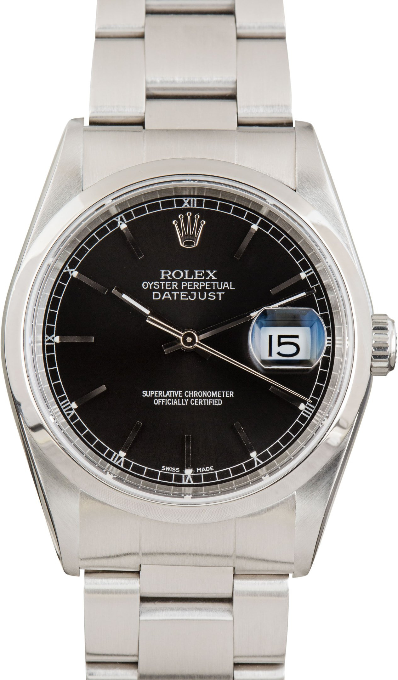 Why We Love This Watch This pre-owned Rolex Datejust ref. 16200 (2000) features a sleek black Superluminova dial and a 36MM stainless steel case, making it a timeless classic. With its iconic Oyster band and robust design, this model offers both style and durability. A perfect choice for any collector or Rolex enthusiast! WATCH DETAILS CREDIT CARD PRICE $7,197.86 BRAND Rolex MODEL NAME Datejust 36 COLLECTION Datejust MODEL NUMBER 16200 YEAR 2000 ITEM NUMBER 181007 CONDITION Excellent GENDER Mens Unisex BOX & PAPERS No Box or Papers CASE MATERIAL Stainless Steel CRYSTAL Sapphire SIZE 36MM BEZEL Stainless Steel Smooth CASEBACK Solid SERIAL P275XXX DIAL Black w/ Index hour markers, Superluminova hands & Superluminova lume MOVEMENT CALIBRE 3135 TYPE Automatic BEZEL Fixed COMPLICATION Date BRACELET MATERIAL Stainless Steel TYPE Oyster CLASP Oysterclasp