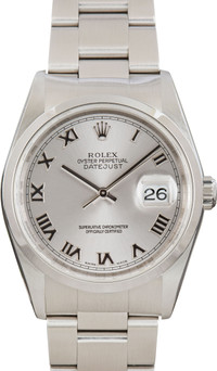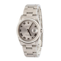 Why We Love This Watch This pre-owned Rolex Datejust ref. 16200 (2003–2005) exudes classic sophistication with its 36mm stainless steel case and smooth bezel. The silver Roman numeral dial adds a touch of refined elegance, while the sturdy Oyster bracelet ensures comfort and durability. Powered by a reliable automatic movement, this Datejust combines timeless style with everyday functionality, making it a quintessential Rolex for any collection. WATCH DETAILS BRAND Rolex MODEL NAME Datejust 36 COLLECTION Datejust MODEL NUMBER 16200 YEAR 2005 ITEM NUMBER 180823 CONDITION Excellent GENDER Mens Unisex BOX & PAPERS No Box or Papers CASE MATERIAL Stainless Steel CRYSTAL Sapphire SIZE 36MM BEZEL Stainless Steel Smooth CASEBACK Solid SERIAL F307XXX DIAL Silver w/ Roman hour markers, Nonluminous hands & Nonluminous lume MOVEMENT CALIBRE 3135 TYPE Automatic BEZEL Fixed COMPLICATION Date BRACELET MATERIAL Stainless Steel TYPE Oyster CLASP Oysterclasp