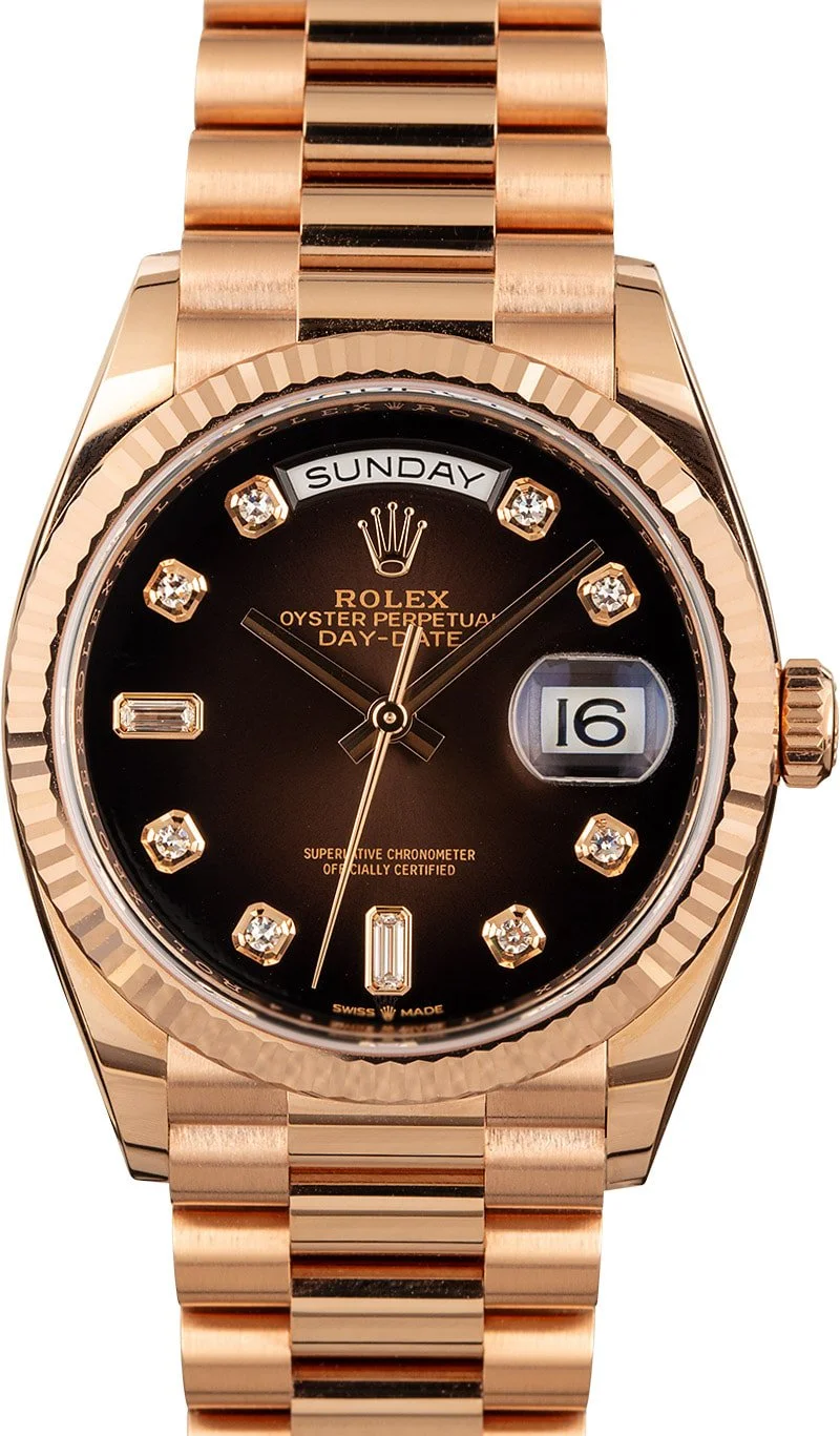 Why We Love This Watch This pre-owned Rolex Day-Date ref. 128235 (2024) showcases timeless elegance through a 36mm Oyster case crafted in 18k Everose gold, continuing a celebrated design first introduced in the 1980s and reimagined in 2019. A rich brown ombre dial transitions seamlessly from color to deep black at the edge, a meticulous lacquered finish accented by diamond hour markers and baguette-cut diamonds at 6 and 9 o’clock. Framed by a fluted bezel and protected by a scratch-resistant sapphire crystal with Cyclops lens, this Day-Date is powered by Calibre 3255 automatic movement from Rolex. Finished on an 18k Everose gold President bracelet and water-resistant to 100 meters, this piece represents refined luxury with unmistakable presence. WATCH DETAILS CREDIT CARD PRICE $53,502.86 BRAND Rolex MODEL NAME Day-Date 36 COLLECTION Day Date MODEL NUMBER 128235 YEAR 2024 ITEM NUMBER 184535 C PL CONDITION Excellent GENDER Mens Unisex BOX & PAPERS Box and Papers CASE MATERIAL Rose Gold CRYSTAL Sapphire SIZE 36MM BEZEL 18k Rose Gold Fluted CASEBACK Solid SERIAL 1P5W0XXX DIAL Brown Diamond w/ Diamond hour markers, Nonluminous hands & Nonluminous lume MOVEMENT CALIBRE 3255 TYPE Automatic BEZEL Fixed COMPLICATION Date BRACELET MATERIAL Rose Gold TYPE President CLASP Concealed folding Crownclasp