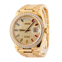 Why We Love This Watch Pre-owned Rolex Day-Date 36 ref. 128348 (2021) is an extraordinary masterpiece, crafted in 18k yellow gold and featuring a diamond-paved dial set with 10 baguette-cut, rainbow-colored sapphires, paired with a diamond-set bezel and the iconic President bracelet. Powered by the in-house Caliber 3255 automatic movement with a 70-hour power reserve, instantaneous day and date display, Parachrom hairspring, and Paraflex shock absorbers, every gemstone is meticulously hand-selected and set to achieve perfect alignment and optimal brilliance. The fluted yellow gold case and semi-circular three-piece links of the President bracelet ensure unmatched elegance, comfort, and refinement—truly a rare and breathtaking example of Rolex artistry and technical excellence. WATCH DETAILS CREDIT CARD PRICE $92,604.86 BRAND Rolex MODEL NAME Day-Date 36 COLLECTION Day Date MODEL NUMBER 128348 YEAR 2021 ITEM NUMBER 183099 C CONDITION Excellent GENDER Mens Womens Unisex BOX & PAPERS Box and Papers CASE MATERIAL Yellow Gold CRYSTAL Sapphire SIZE 36MM BEZEL 18k Yellow Gold Diamond CASEBACK Solid DIAL Diamond Paved w/ Sapphires hour markers, Nonluminous hands & Nonluminous lume MOVEMENT CALIBRE 3255 TYPE Automatic BEZEL Fixed COMPLICATION Date BRACELET MATERIAL Yellow Gold TYPE President CLASP Concealed folding Crownclasp