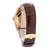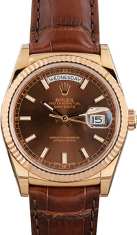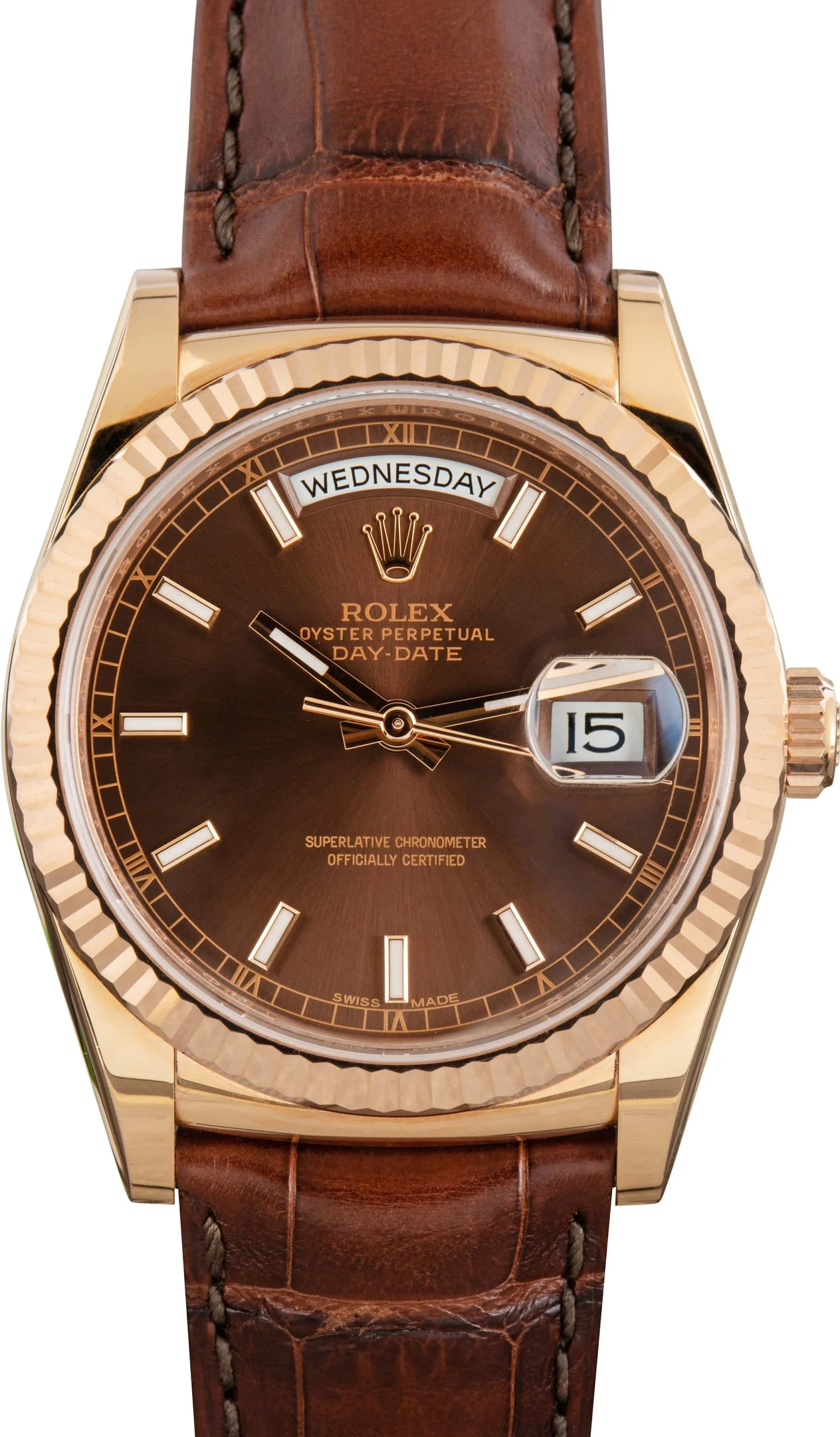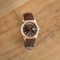 Why We Love This Watch This pre-owned Rolex Day-Date 36 ref. 118135 (2017) exudes refined elegance with a warm, luxurious presence. Crafted in 18k Everose gold, it features a sharp fluted bezel paired with a rich chocolate brown dial set with luminous index hour markers for enhanced readability. The 36mm case is complemented by a supple Rolex leather strap, combining sophistication with comfort. Powered by Rolex’s dependable automatic movement, this Day-Date delivers precision, reliability, and timeless style in a beautifully executed design. WATCH DETAILS BRAND Rolex MODEL NAME Day-Date 36 COLLECTION Day Date MODEL NUMBER 118135 YEAR 2020 ITEM NUMBER 184198 CONDITION Excellent GENDER Mens Unisex BOX & PAPERS Box and Papers CASE MATERIAL Rose Gold CRYSTAL Sapphire SIZE 36MM BEZEL 18k Rose Gold Fluted CASEBACK Solid SERIAL 909HCXXX DIAL Brown Chocolate w/ Index hour markers, Superluminova hands & Superluminova lume MOVEMENT CALIBRE 3155 TYPE Automatic BEZEL Fixed COMPLICATION Date BRACELET MATERIAL Leather TYPE Rolex Leather Strap CLASP Deployant