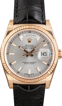 Why We Love This Watch This pre-owned Rolex Day-Date 36 ref. 118135 (2017) exudes classic elegance with a confident presence. Crafted in 18k Everose gold, it features a sharp fluted bezel and a clean silver dial with index hour markers filled with Superluminova for enhanced legibility. The 36mm case, caseback, and matching gold clasp are all factory stickered, paired with a supple Rolex leather strap for a refined yet robust look. Powered by Rolex’s trusted automatic movement, this Day-Date delivers precision, reliability, and unmistakable style in every detail. WATCH DETAILS BRAND Rolex MODEL NAME Day-Date 36 COLLECTION Day Date MODEL NUMBER 118135 YEAR 2017 ITEM NUMBER 182349 CONDITION Excellent GENDER Mens Unisex BOX & PAPERS Papers Only CASE MATERIAL Rose Gold CRYSTAL Sapphire SIZE 36MM BEZEL 18k Rose Gold Fluted CASEBACK Solid SERIAL 20P3FXXX DIAL Silver w/ Index hour markers, Superluminova hands & Superluminova lume MOVEMENT CALIBRE 3155 TYPE Automatic BEZEL Fixed COMPLICATION Date BRACELET MATERIAL Leather TYPE Rolex Leather Strap CLASP Deployant
