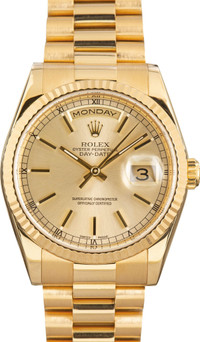 Why We Love This Watch This pre-owned Rolex Day-Date ref. 118238 (2003 - 2005) exudes classic luxury and refined craftsmanship. The 36mm 18k yellow gold case is complemented by a fluted bezel and a champagne index dial, offering a clean and elegant display. Powered by the Caliber 3155 automatic movement with day and date functions, and fitted with the iconic President bracelet, this Day-Date embodies timeless Rolex prestige, precision, and sophistication. WATCH DETAILS CREDIT CARD PRICE $29,321.36 BRAND Rolex MODEL NAME Day-Date 36 COLLECTION Day Date MODEL NUMBER 118238 YEAR 2005 ITEM NUMBER 184435 CONDITION Excellent GENDER Mens Unisex BOX & PAPERS Box and Papers CASE MATERIAL Yellow Gold CRYSTAL Sapphire SIZE 36MM BEZEL 18k Yellow Gold Fluted CASEBACK Solid SERIAL F010XXX DIAL Champagne w/ Index hour markers, Superluminova hands & Superluminova lume MOVEMENT CALIBRE 3155 TYPE Automatic BEZEL Fixed COMPLICATION Date BRACELET MATERIAL Yellow Gold TYPE President CLASP Concealed Crownclasp