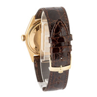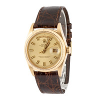 Why We Love This Watch Pre-owned Rolex Day-Date ref. 1803 (1969). This classic 36mm yellow gold timepiece features a champagne dial with elegant stick hour markers, paired with a genuine Rolex leather strap and tang buckle. Powered by a reliable automatic movement, it displays both the day and date, epitomizing Rolex’s timeless design, craftsmanship, and understated luxury. WATCH DETAILS BRAND Rolex MODEL NAME Day-Date 36 COLLECTION Day Date MODEL NUMBER 1803 YEAR 1969 ITEM NUMBER 175888 CONDITION Vintage GENDER Mens Unisex BOX & PAPERS No Box or Papers CASE MATERIAL Yellow Gold CRYSTAL Acrylic SIZE 36MM BEZEL 18k Yellow Gold Fluted CASEBACK Solid SERIAL 2408XXX DIAL Champagne w/ Index hour markers, Tritium hands & Tritium lume MOVEMENT CALIBRE 1556 TYPE Automatic BEZEL Fixed COMPLICATION Date BRACELET MATERIAL Leather TYPE Rolex Leather Strap CLASP Rolex Tang Buckle