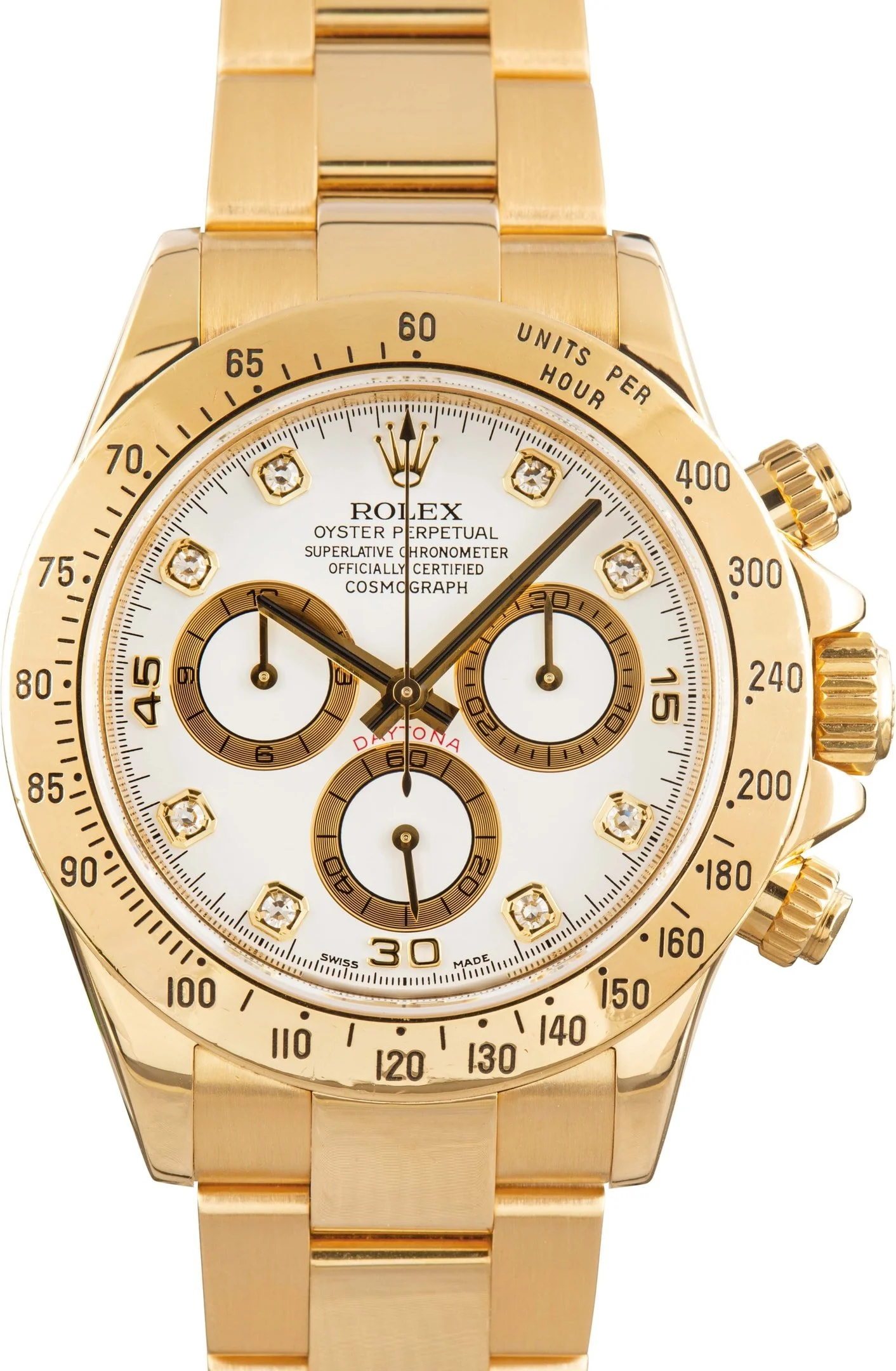 Why We Love This Watch This pre-owned Rolex Daytona ref. 116528 (2008–2009) features a 40mm 18k yellow gold case paired with a matching Oyster bracelet. A crisp white dial is accented by diamond hour markers, combining sporty chronograph functionality with luxurious detailing. Elegant, powerful, and unmistakably Rolex, this Daytona is a statement-making timepiece for any collection. WATCH DETAILS BRAND Rolex MODEL NAME Daytona MODEL NUMBER 116528 YEAR 2009 ITEM NUMBER 183113 CONDITION Excellent GENDER Mens BOX & PAPERS Rolex Papers CASE MATERIAL Yellow Gold CRYSTAL Sapphire SIZE 40MM BEZEL 18k Yellow Gold Tachymetric CASEBACK Solid SERIAL V428XXX DIAL White Diamond w/ Diamond hour markers, Nonluminous hands & Nonluminous lume MOVEMENT CALIBRE 4130 TYPE Automatic BEZEL Fixed COMPLICATION Chronograph BRACELET MATERIAL Yellow Gold TYPE Oyster CLASP Oysterlock