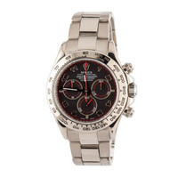 Why We Love This Watch A bold expression of speed and style, this pre-owned Rolex Daytona ref. 116509 (2005 - 2006) stands out with its striking black Arabic dial, accented by red details that add a touch of sportiness to its design. Crafted from 18k white gold, the 40mm case exudes luxury while maintaining the Daytona’s signature racing heritage. Powered by the Rolex Caliber 4130, this self-winding chronograph delivers precision timing and a 72-hour power reserve. With its perfect blend of performance and exclusivity, this Daytona is a must-have for collectors and enthusiasts alike. WATCH DETAILS BRAND Rolex MODEL NAME Daytona MODEL NUMBER 116509 YEAR 2006 ITEM NUMBER 172073 CONDITION Excellent GENDER Mens BOX & PAPERS No Box or Papers CASE MATERIAL White Gold CRYSTAL Sapphire SIZE 40MM BEZEL 18k White Gold Tachymetric SERIAL D228XXX DIAL Black w/ Arabic hour markers, Superluminova hands & Superluminova lume MOVEMENT CALIBRE 4130 TYPE Automatic BEZEL Fixed COMPLICATION Chronograph BRACELET MATERIAL White Gold TYPE Oyster CLASP Oysterlock