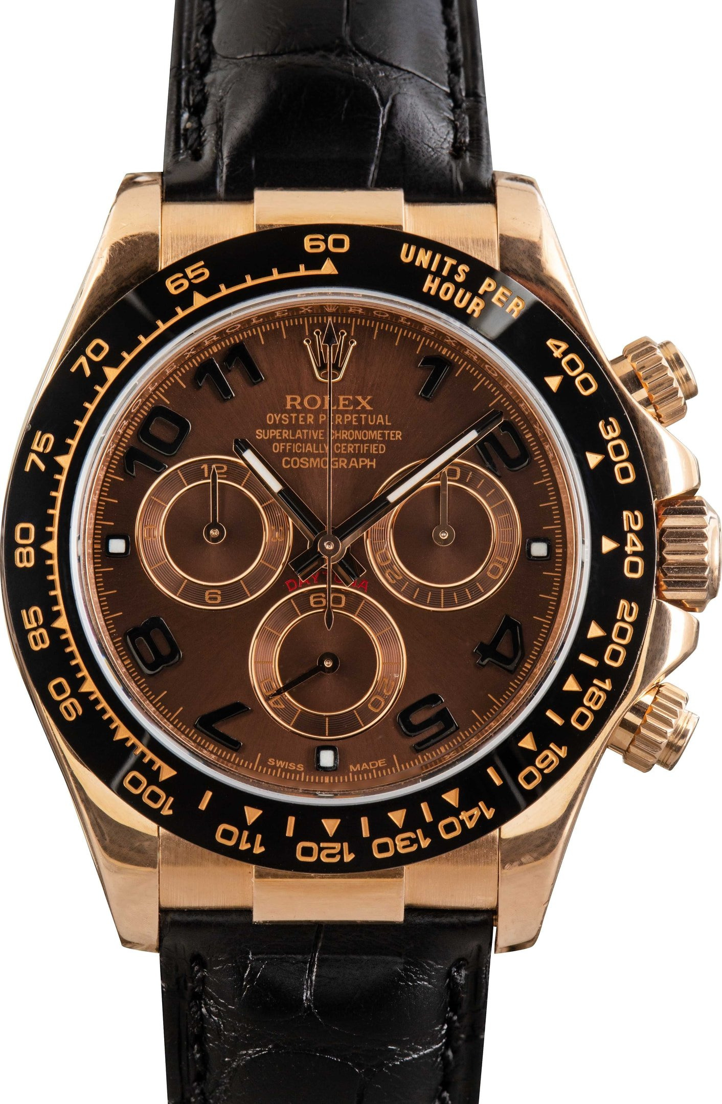Why We Love This Watch Crafted from 18k Everose gold, this Daytona pairs rich materials with bold aesthetics. The chocolate dial features contrasting Arabic numerals and chronograph sub-dials, offering a distinctive, highly legible display. A sleek black leather strap adds contrast and elegance, anchoring the 40mm case with classic appeal. Powered by Rolex’s Caliber 4130, this timepiece blends luxury and performance with signature Daytona precision. WATCH DETAILS CREDIT CARD PRICE $39,096.86 BRAND Rolex MODEL NAME Daytona MODEL NUMBER 116515 YEAR 2013 ITEM NUMBER 175884 C CONDITION Excellent GENDER Mens BOX & PAPERS Papers Only CASE MATERIAL Rose Gold CRYSTAL Sapphire SIZE 40MM BEZEL Ceramic Tachymetric SERIAL 86J28XXX DIAL Brown w/ Arabic hour markers, Chromalight hands & Chromalight lume MOVEMENT CALIBRE 4130 TYPE Automatic BEZEL Fixed COMPLICATION Chronograph BRACELET MATERIAL Leather TYPE Leather CLASP Oysterlock