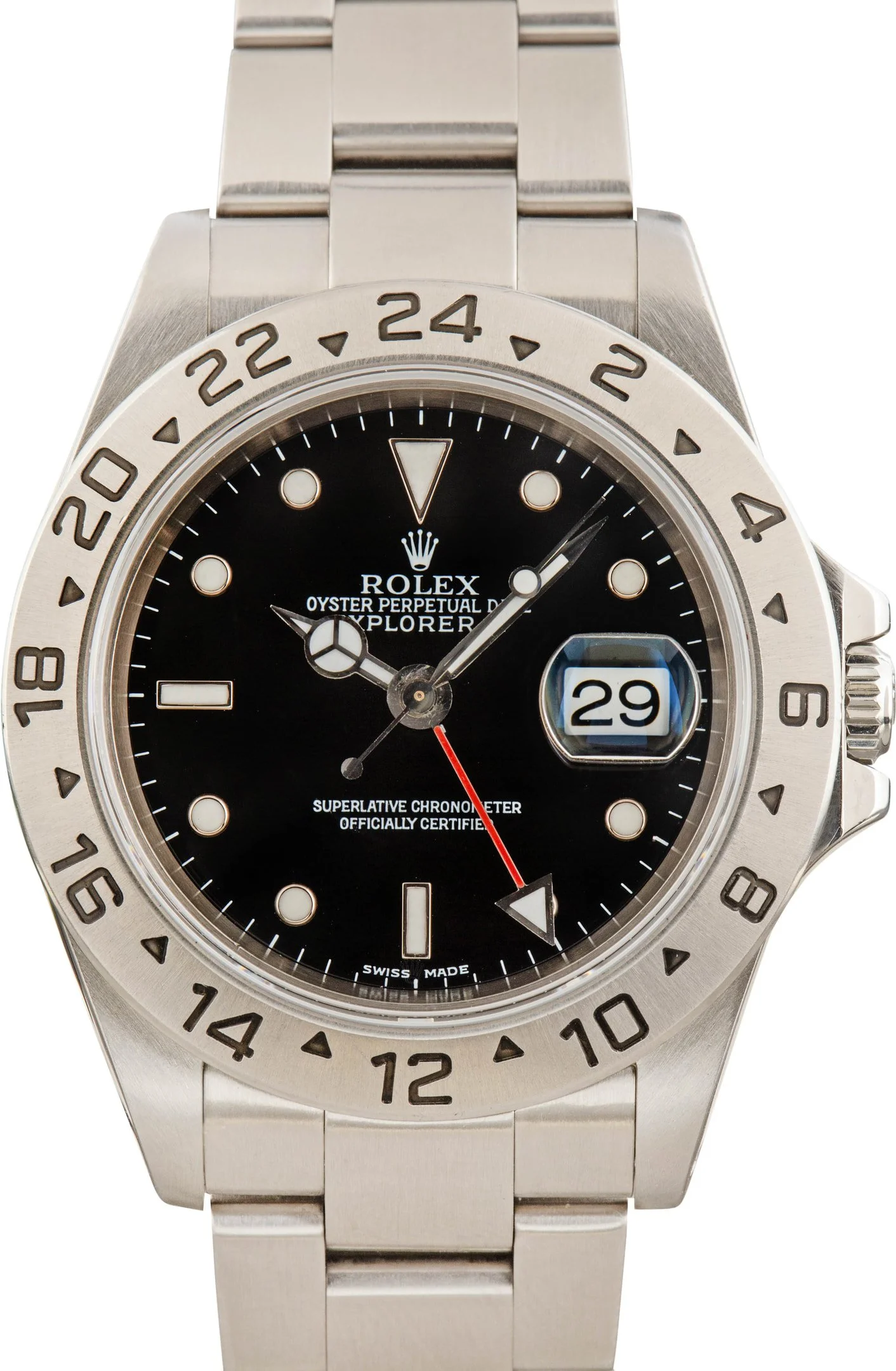 Why We Love This Watch This Rolex Explorer II ref. 16570 (2000 - 2001) features a 40mm stainless steel case with a 24-hour graduated bezel. It is equipped with a black superluminova dial and paired with an Oyster bracelet, driven by the 3185 movement. WATCH DETAILS BRAND Rolex MODEL NAME Explorer II MODEL NUMBER 16570 YEAR 2001 ITEM NUMBER 180458 CONDITION Excellent GENDER Mens BOX & PAPERS No Box or Papers CASE MATERIAL Stainless Steel CRYSTAL Sapphire SIZE 40MM BEZEL Stainless Steel 24-hour CASEBACK Solid SERIAL K230XXX DIAL Black w/ Luminous hour markers, Superluminova hands & Superluminova lume MOVEMENT CALIBRE 3185 TYPE Automatic BEZEL Fixed COMPLICATION Date BRACELET MATERIAL Stainless Steel TYPE Oyster CLASP Fliplock