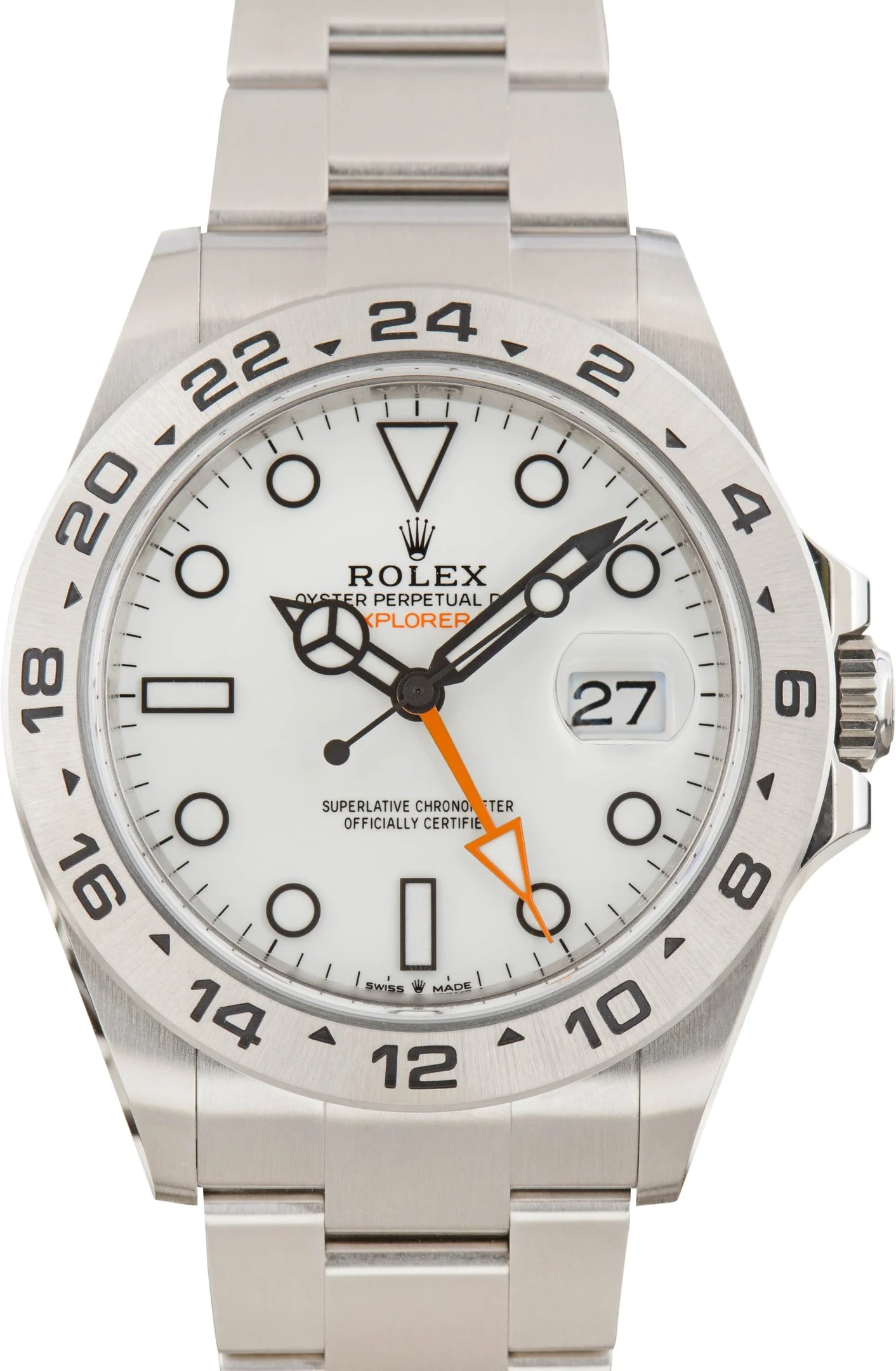 WATCH DETAILS BRAND Rolex MODEL NAME Explorer II MODEL NUMBER 226570 NICKNAME Polar YEAR 2023 ITEM NUMBER 184285 CONDITION Excellent GENDER Mens BOX & PAPERS Box and Papers CASE MATERIAL Stainless Steel CRYSTAL Sapphire SIZE 42MM BEZEL Stainless Steel 24-hour CASEBACK Solid SERIAL 18Y76XXX DIAL White Polar w/ Luminous hour markers, Chromalight hands & Chromalight lume MOVEMENT CALIBRE 3285 TYPE Automatic BEZEL Fixed COMPLICATION Date BRACELET MATERIAL Stainless Steel TYPE Oyster CLASP Oysterlock