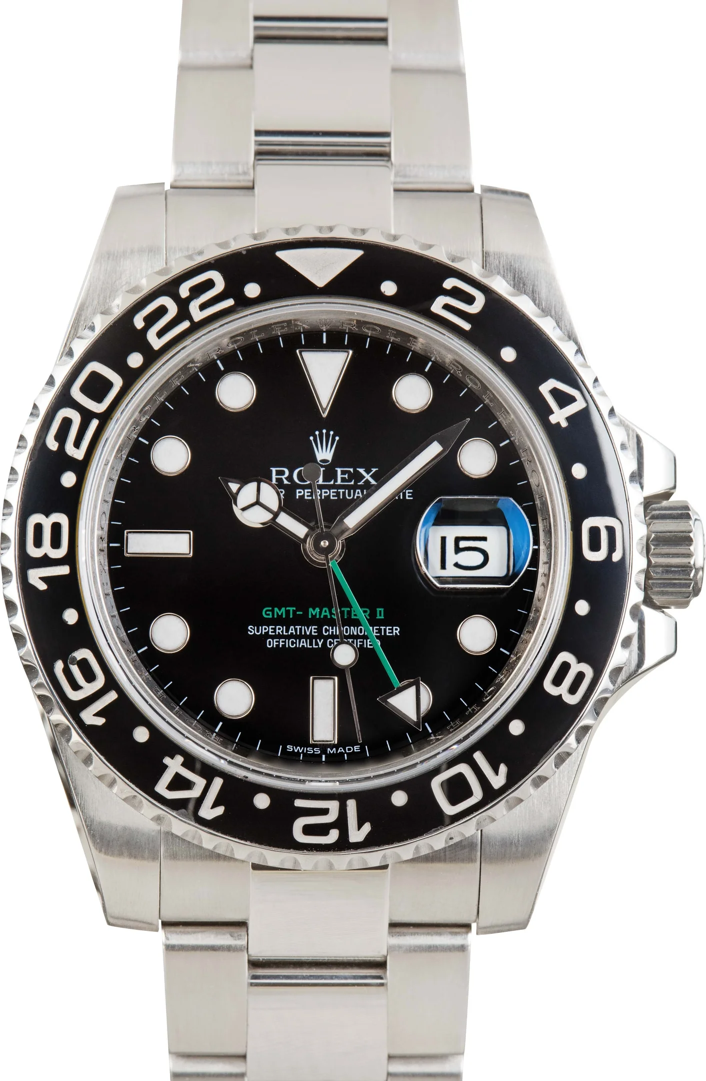 Why We Love This Watch This pre-owned Rolex GMT-Master II ref 116710 (2008–2009) combines modern design with classic functionality. It features a black Super-LumiNova dial and a black ceramic bezel, both housed in a durable stainless steel case. Powered by the Rolex Caliber 3186 automatic movement, it provides dual time zone capability and reliable precision. Completed with an Oyster bracelet, this GMT-Master II delivers a sleek and versatile look suited for both travel and everyday wear. WATCH DETAILS BRAND Rolex MODEL NAME GMT-Master II COLLECTION GMT-Master MODEL NUMBER 116710 YEAR 2009 ITEM NUMBER 183622 CONDITION Excellent GENDER Mens BOX & PAPERS Box and Papers CASE MATERIAL Stainless Steel CRYSTAL Sapphire SIZE 40MM BEZEL Ceramic 24-hour CASEBACK Solid SERIAL V358XXX DIAL Black w/ Luminous hour markers, Superluminova hands & Superluminova lume MOVEMENT CALIBRE 3186 TYPE Automatic BEZEL Bidirectional COMPLICATION Date BRACELET MATERIAL Stainless Steel TYPE Oyster CLASP Oysterlock