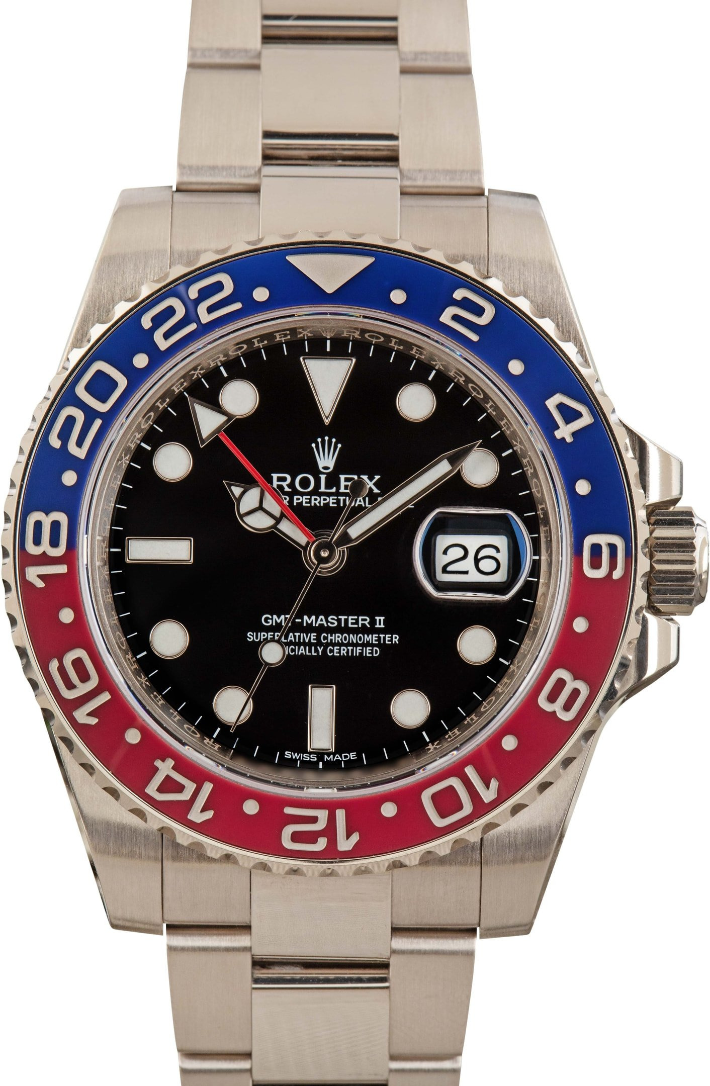 Why We Love This Watch Pre-owned Rolex GMT-Master II ref 116719BLRO (2014) — This exceptional GMT-Master II marks the debut of the red and blue “Pepsi” Cerachrom bezel in Rolex’s lineup, crafted from robust ceramic for lasting color and durability. The 40mm case, rendered in solid 18k white gold, is paired with a rich blue dial for a distinctive and luxurious aesthetic. Powered by the Calibre 3186, it offers precise dual time zone tracking, a 48-hour power reserve, and legendary Rolex reliability. A 2014 release that blends the heritage of the GMT-Master with modern innovation and precious metal elegance. WATCH DETAILS CREDIT CARD PRICE $39,096.86 BRAND Rolex MODEL NAME GMT-Master II COLLECTION GMT-Master MODEL NUMBER 116719 NICKNAME Pepsi YEAR 2014 ITEM NUMBER 180871 CONDITION Excellent GENDER Mens BOX & PAPERS Box and Papers CASE MATERIAL White Gold CRYSTAL Sapphire SIZE 40MM BEZEL Ceramic 24-hour SERIAL 605M4XXX DIAL Black w/ Luminous hour markers, Chromalight hands & Chromalight lume MOVEMENT CALIBRE 3186 TYPE Automatic BEZEL Bidirectional COMPLICATION Date BRACELET MATERIAL White Gold TYPE Oyster CLASP Oysterlock
