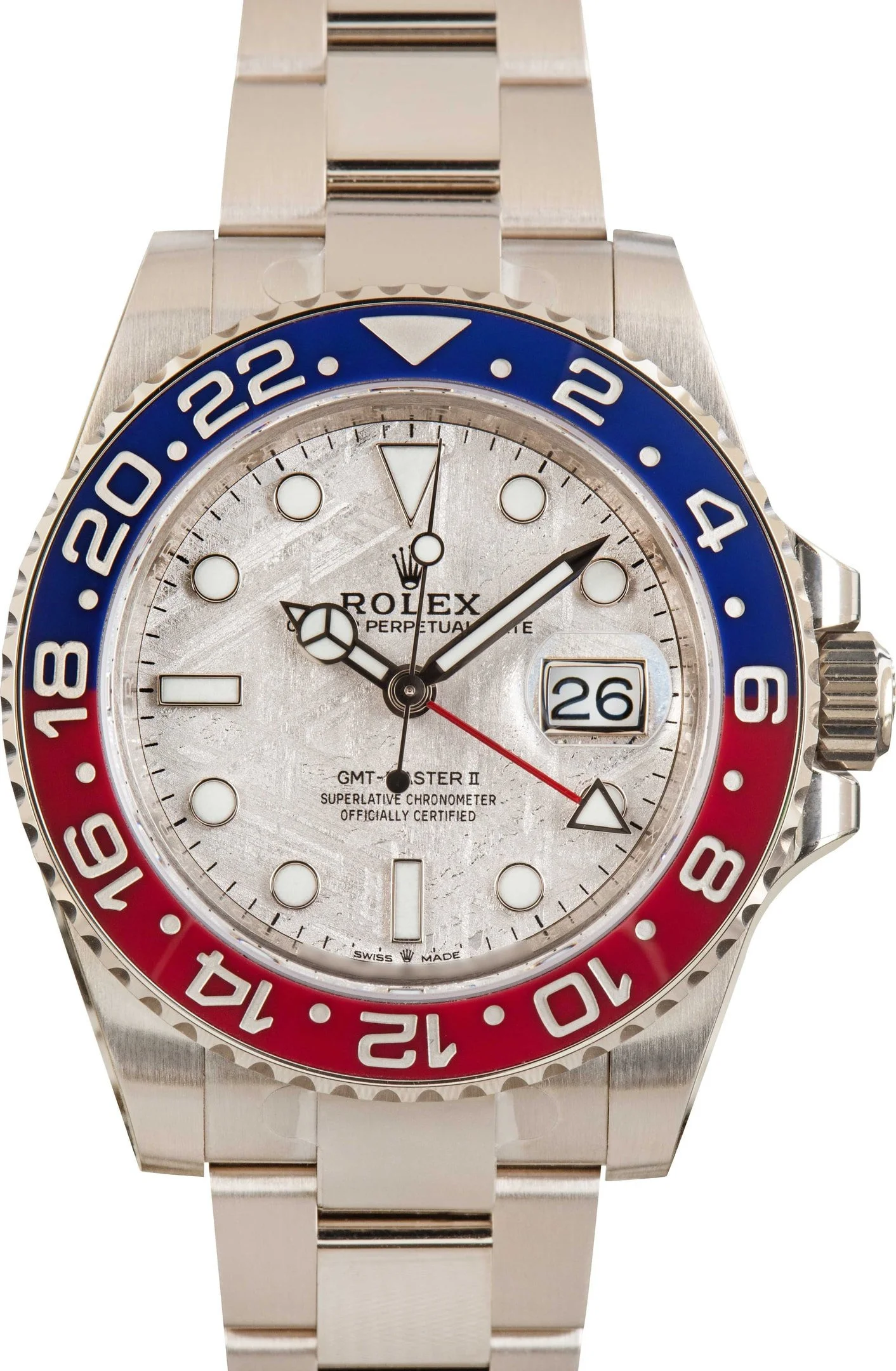 Why We Love This Watch This pre-owned Rolex GMT-Master II ref. 126719 (2021) showcases a captivating blend of luxury and rarity. Crafted in 18k white gold, this model is distinguished by a striking meteorite dial, ensuring no two examples are exactly alike. The iconic red and blue “Pepsi” Cerachrom bezel adds vibrant contrast while honoring the GMT-Master II’s storied aviation heritage. Powered by Rolex’s in-house automatic movement and finished with exceptional attention to detail, this GMT-Master II transcends traditional timekeeping—standing as a remarkable expression of craftsmanship, adventure, and collectible appeal. WATCH DETAILS CREDIT CARD PRICE $60,191.36 BRAND Rolex MODEL NAME GMT-Master II COLLECTION GMT-Master MODEL NUMBER 126719 NICKNAME Pepsi YEAR 2023 ITEM NUMBER 184496 C PL CONDITION Excellent GENDER Mens BOX & PAPERS Box and Papers CASE MATERIAL White Gold CRYSTAL Sapphire SIZE 40MM BEZEL Ceramic Timing CASEBACK Solid SERIAL RW189XXX DIAL Silver Meteorite w/ Luminous hour markers, Chromalight hands & Chromalight lume MOVEMENT CALIBRE 3285 TYPE Automatic BEZEL Bidirectional COMPLICATION Date BRACELET MATERIAL White Gold TYPE Oyster CLASP Oysterlock