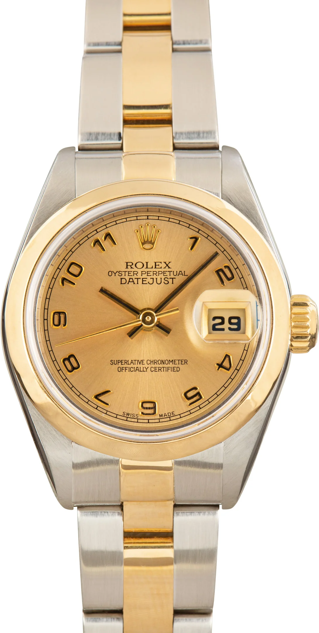 Why We Love This Watch This used Ladies Rolex Datejust ref. 79163 (1999) features a 26mm stainless steel case, a champagne dial with Arabic numerals, and a two-tone Oyster bracelet. The 18k yellow gold smooth bezel adds a touch of elegance. Powered by Rolex’s self-winding movement, this classic timepiece combines timeless design with reliable performance, making it a versatile choice for everyday wear or a cherished collection. WATCH DETAILS BRAND Rolex MODEL NAME Lady Datejust COLLECTION Datejust MODEL NUMBER 79163 YEAR 1999 ITEM NUMBER 183290 CONDITION Excellent GENDER Womens BOX & PAPERS Box and Papers CASE MATERIAL Steel and Gold CRYSTAL Sapphire SIZE 26MM BEZEL Steel & Gold Smooth CASEBACK Solid SERIAL A100XXX DIAL Champagne w/ Arabic hour markers, Nonluminous hands & Nonluminous lume MOVEMENT CALIBRE 2235 TYPE Automatic BEZEL Fixed COMPLICATION Date BRACELET MATERIAL Two-Tone TYPE Oyster CLASP Oysterclasp